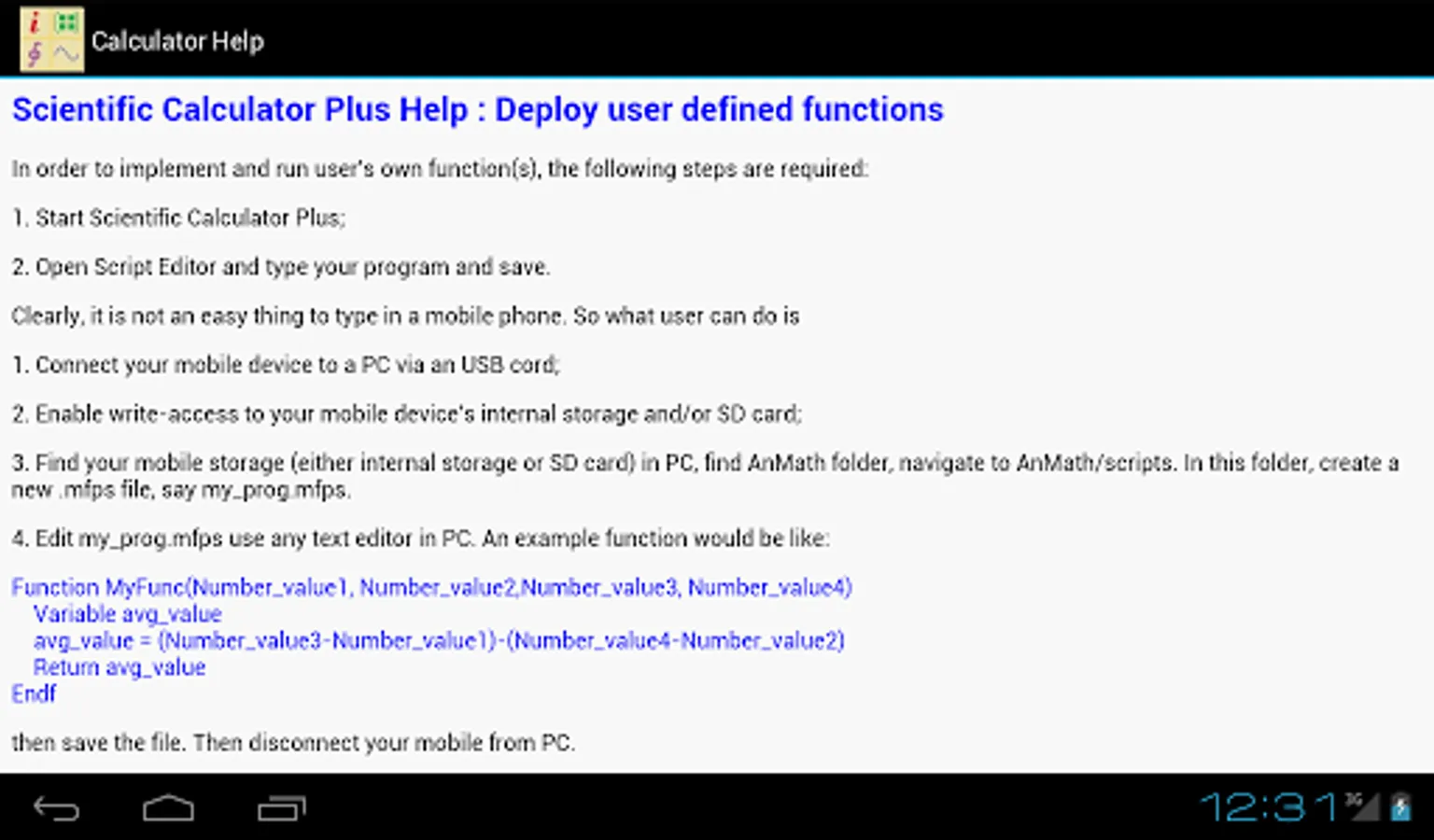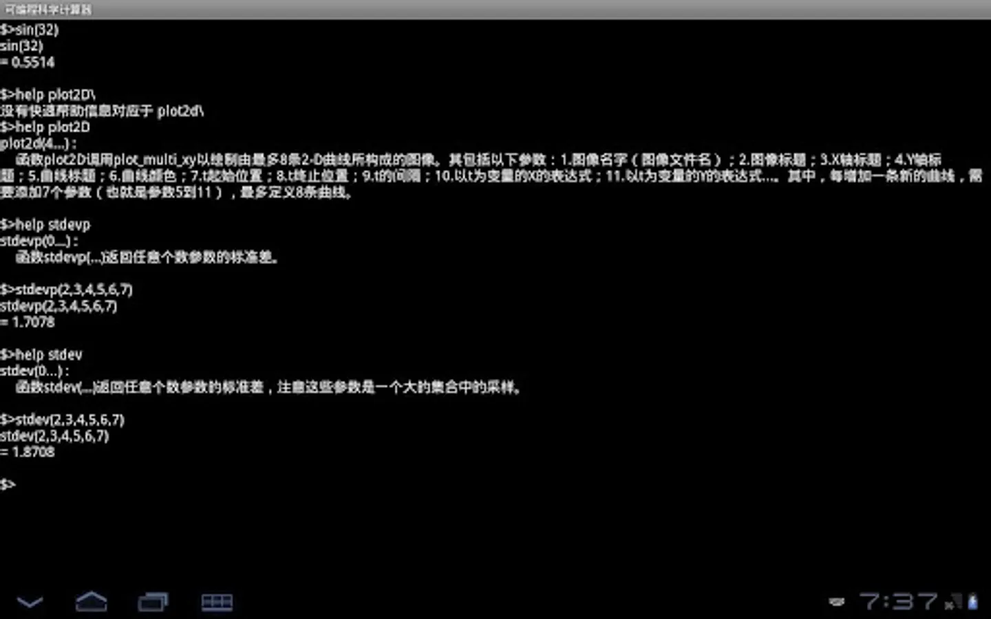 1. Programming and game development: This app is actually a shell of open source scripting language called MFP. This language is object-oriented and able to call all the built-in functions and all the user-defined libs stored in AnMath/scripts folder in Android internal memory / SD card / hard disk. This language includes a group of 2D game APIs, internally supports complex number and matrix, and provides a complete set of functions for graphing, networking, file operating, time / date etc. You can even embed MFP into your Android app.