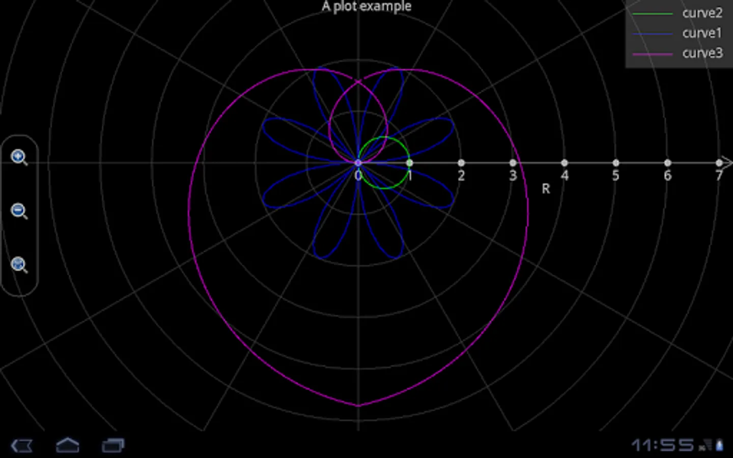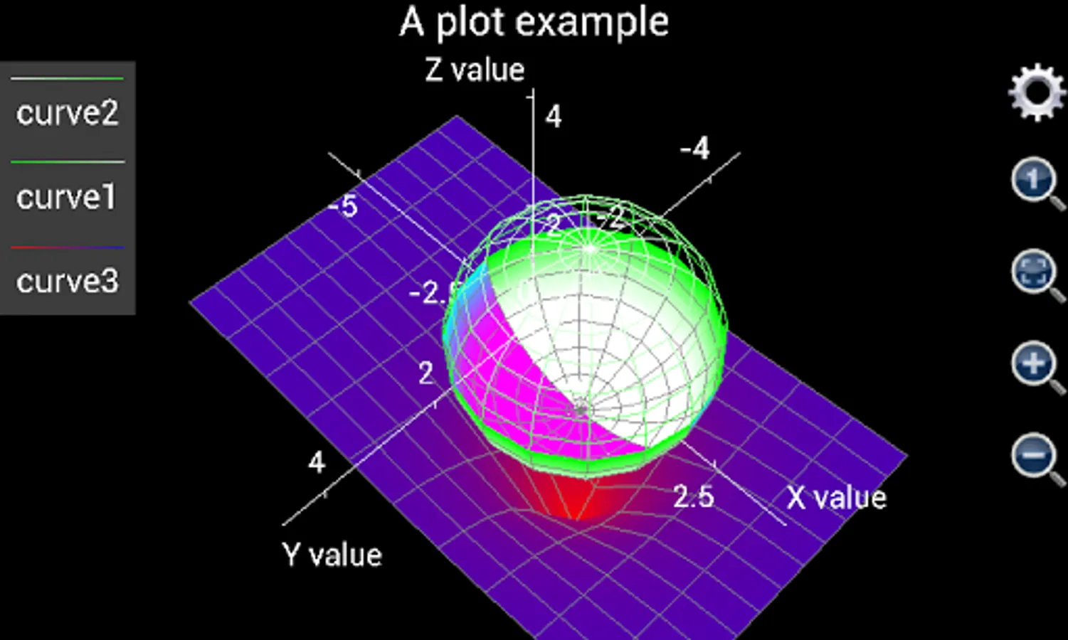 4. Plotting 2D, polar 3D charts: In smart calculator, user inputs the expressions and Scientific Calculator Plus automatically determines what kind of graph to draw. For example, if user inputs x**2+y**2+z**2==1, a 3D ball is drawn. Scientific Calculator Plus also provides stand alone tools to draw complicated graphs and a set of functions to draw charts from command line.