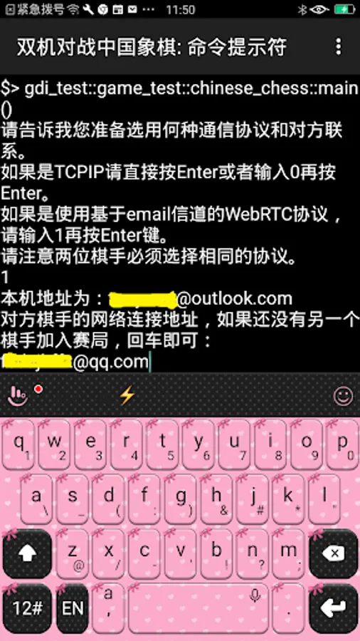 If you use the WebRTC protocol based on email addresses for point-to-point communication, you can achieve long-distance (thousands of kilometers) chess battles. The process of starting the game is similar to using the TCPIP protocol. After the first player starts, wait for the second player to start and enter the email address of the first player to connect. If the connection is successful, the game will start. But one thing is different from using the TCPIP protocol. The first time you use the WebRTC protocol for peer-to-peer communication, you need to set the e-mail address of the machine. You need to enter your email address and password when setting up (note that this password is the password used when sending and receiving emails with SMTP and IMAP protocols, and it is not necessarily the same as the password used to log in to the web page for email checking). If you are using Microsoft Outlook mailbox, Tencent QQ mailbox, Yahoo mailbox or Google gmail mailbox, you do not need to enter other information, otherwise you need to enter smtp and imap server information.