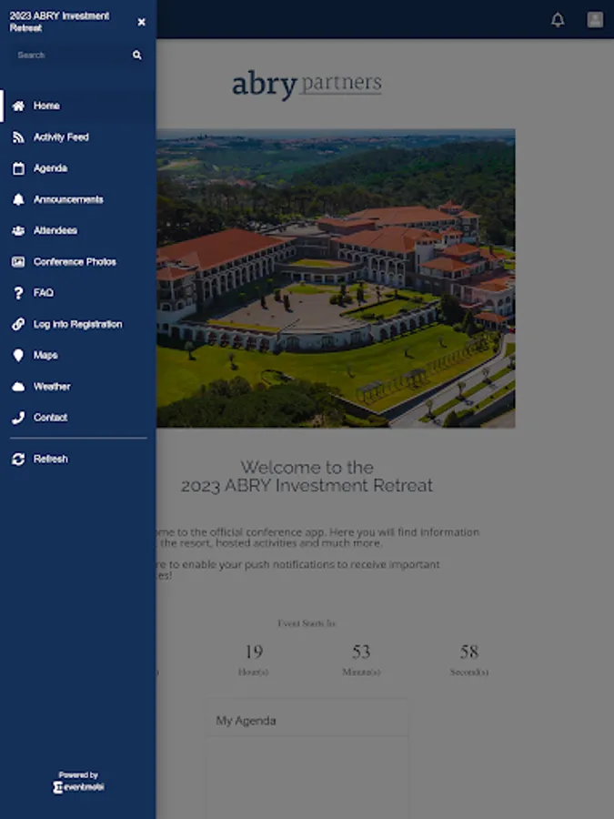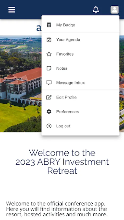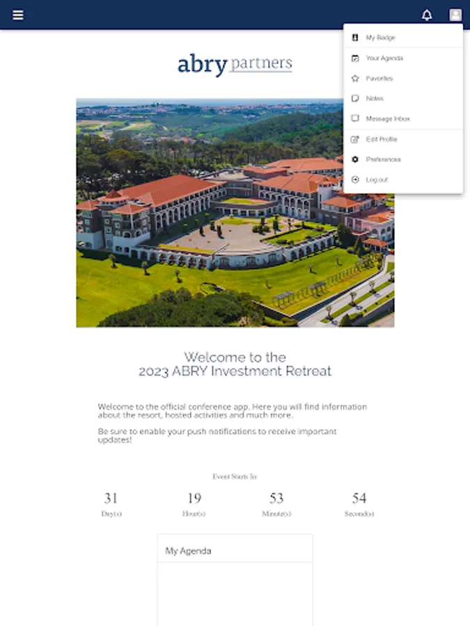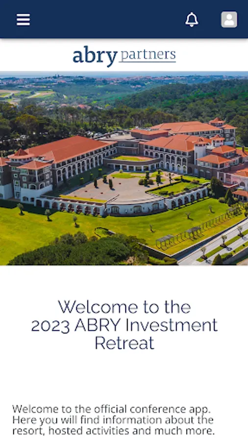Welcome to the 2023 ABRY Investment Retreat in beautiful Sintra, Portugal! This official app is your go-to source to keep you informed during your stay. Includes the retreat agenda, event details, resort maps, and photo sharing. Be sure you enable push notifications on your mobile device to receive important updates on schedules, weather, and more.