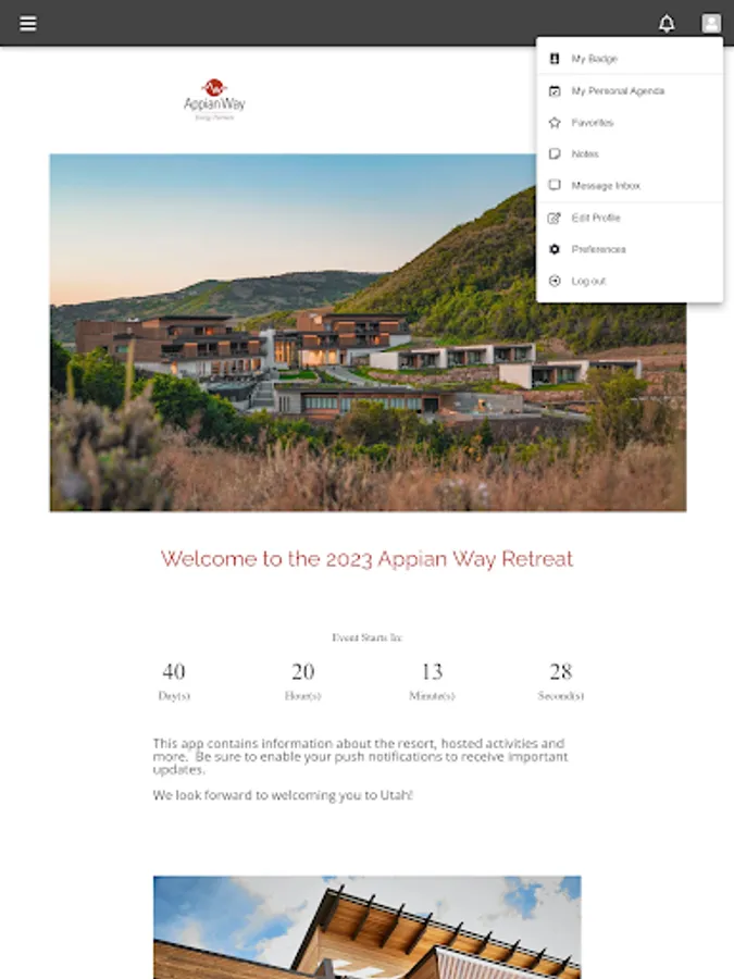 Welcome to the 2023 Appian Way Retreat held at the Lodge at Blue Sky in Utah! This official app is your go-to source to keep you informed during your stay. Includes a personal retreat agenda, event details, resort maps, and photo sharing. Be sure to enable push notifications on your mobile device to receive important updates on schedules, weather, and more.