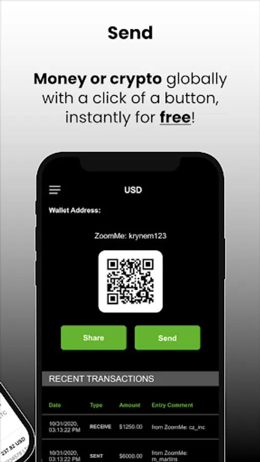 Whether it’s USD, Bitcoin, or any other crypto coins, ZoomMe is a free money transfer service allowing you to seamlessly transfer crypto or send money to your friends and family internationally with the click of a button.