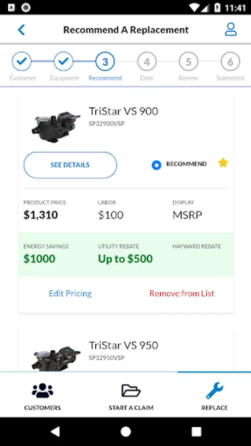 This application is designed to assist swimming pool equipment professionals in providing their customers with various product alternatives that Hayward has to offer, and the relative benefits of each. It allows the servicer/dealer to create an estimate for replacement equipment options for the customer. At the end of the process, an email is sent to their customer, allowing them to click to review the details of the proposal and indicate which product alternative they wish to proceed with.