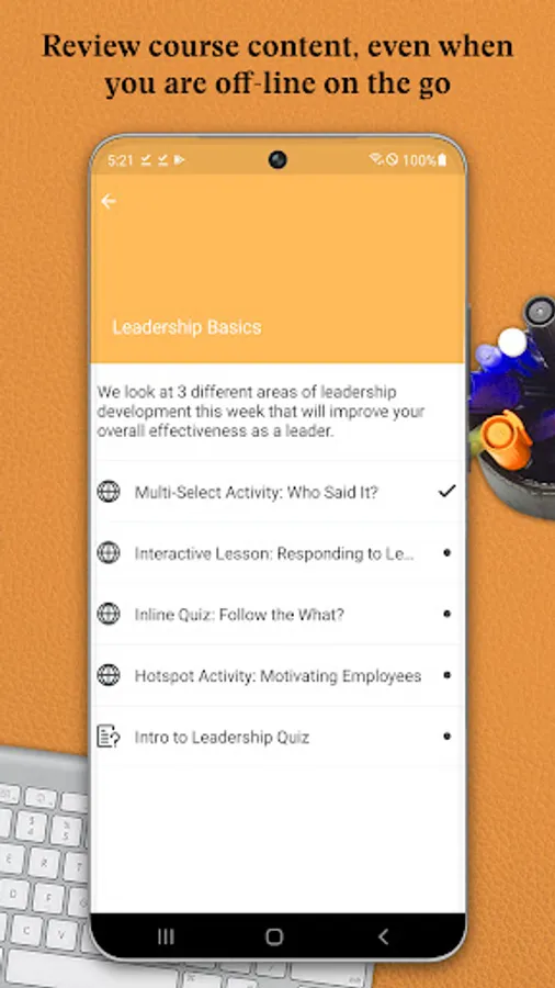 - Review course content off-line without a data connection, including video and audio content
