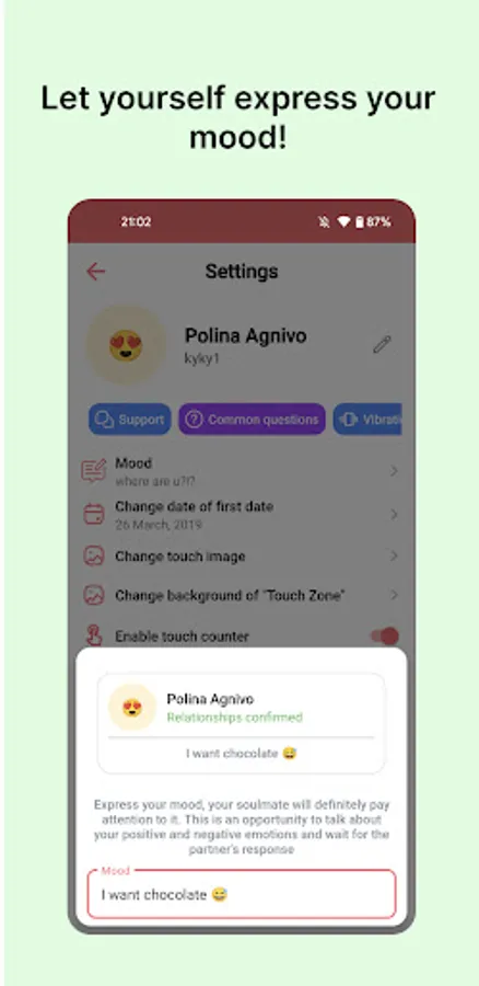 You can set any avatar for your soulmate so that touching it brings you not only tactile, but also visual pleasure.