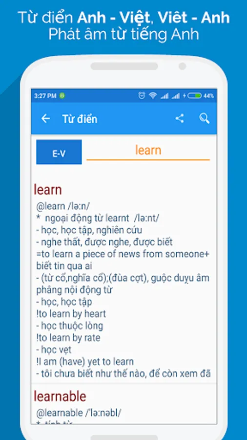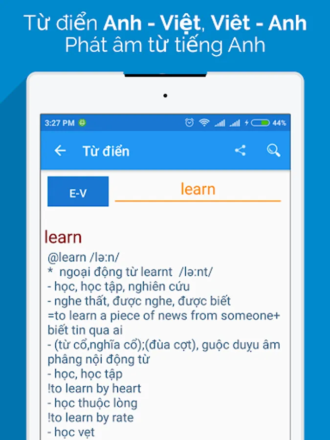 + Dictionary English - Vietnamese (E - V), Dictionary Vietnamese - English (V - E) support from the fast and pronounce vocabulary