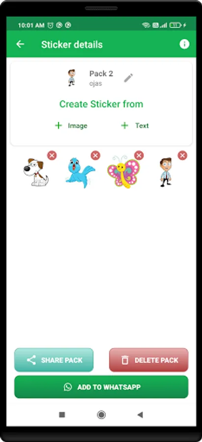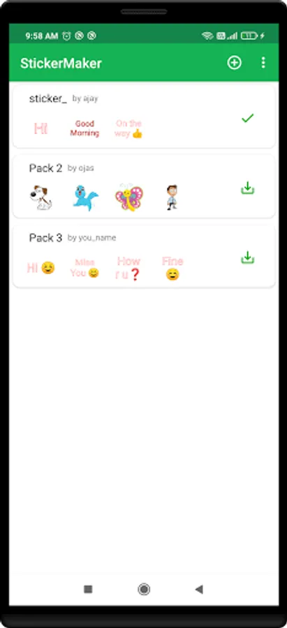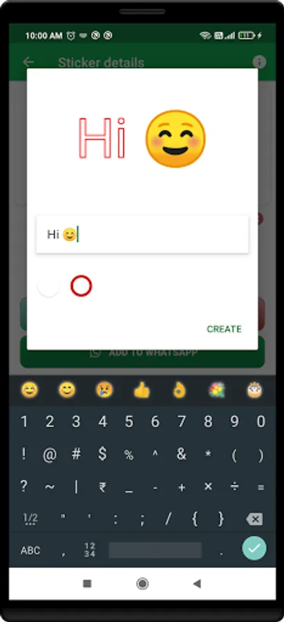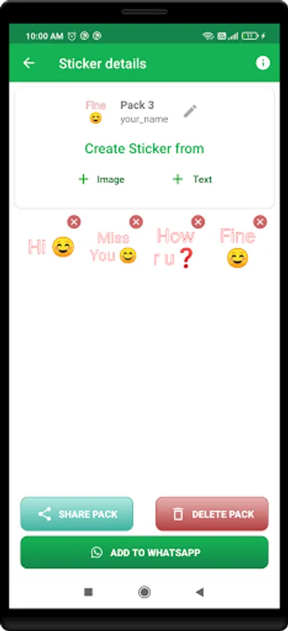 StickerMaker WA provides functionalities to Create Build and Add Sticker from your images and texts like "Hi", "How r u ?", "Fine". You can create custom sticker pack and add into your library. After adding pack in application you can quickly send to you loved once.
