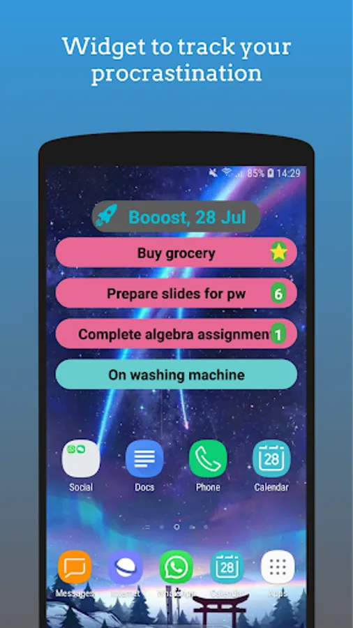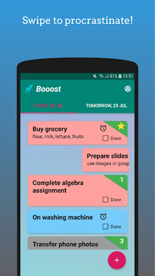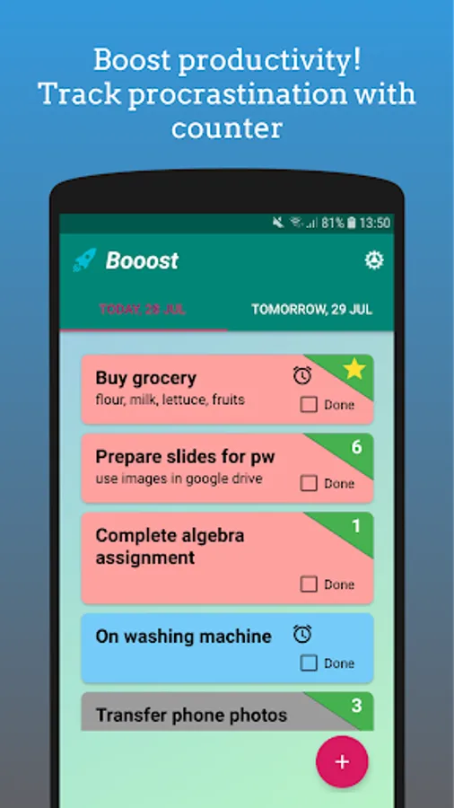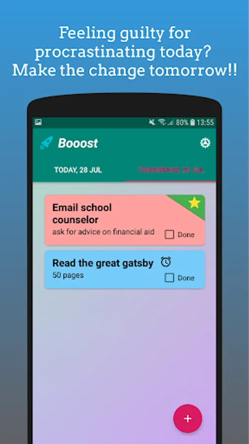 Forget to buy shampoo? Feel like doing that pesky math homework later but afraid you will forget? Feeling guilty at night for wasting the day away? Download Booost to solve all these problems!