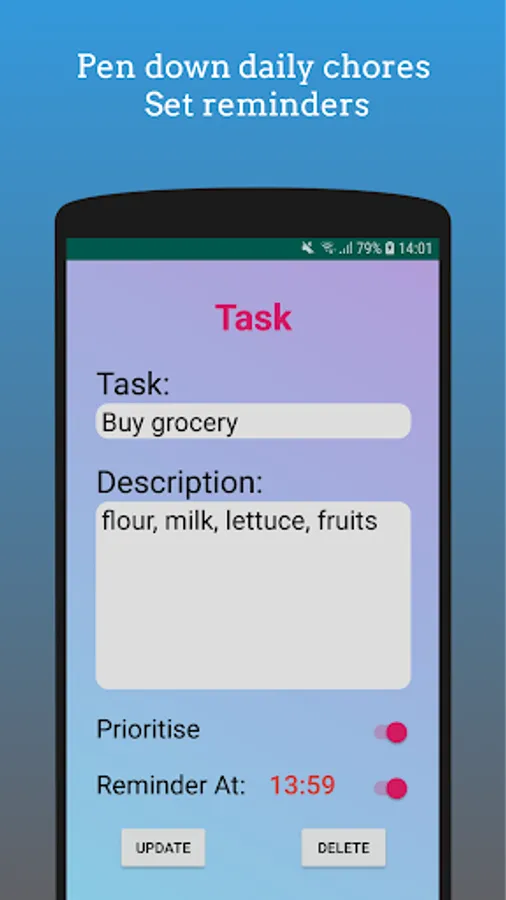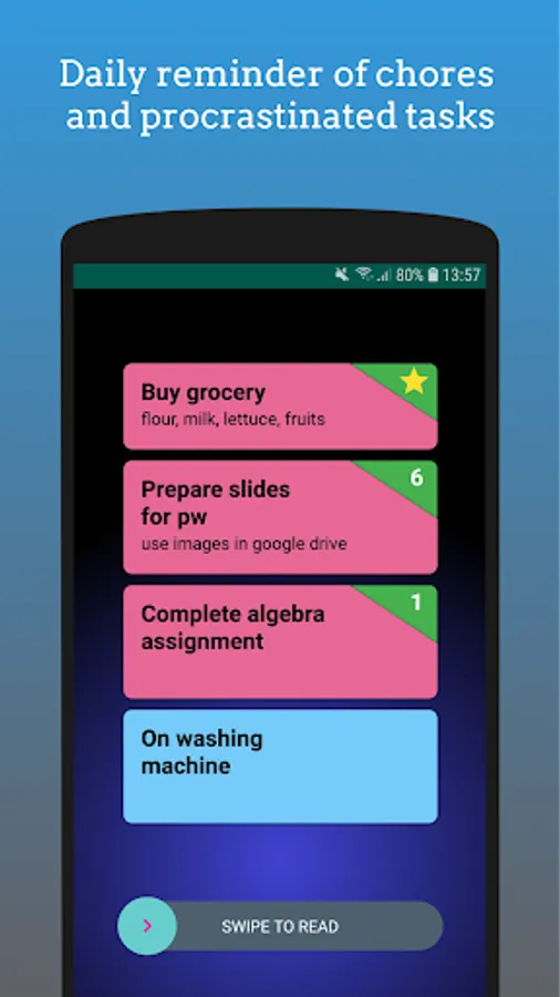 ◾ Daily Alarm - Start a productive day with a reminder of uncompleted tasks and ongoing procrastinations!