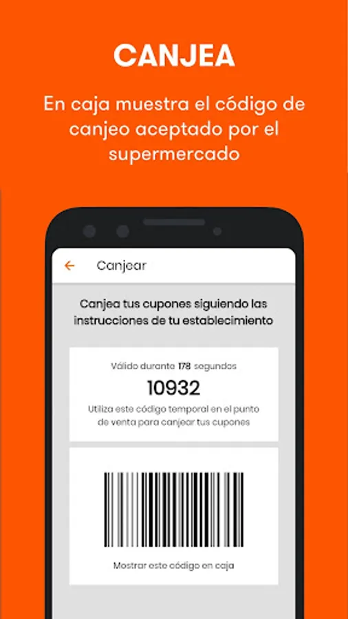 When you go to the supermarket checkout, you will have to identify yourself so that the coupons and the corresponding discounts can be applied. To do this, you must click on the "Redeem" button and use the redemption method that your shop accepts: