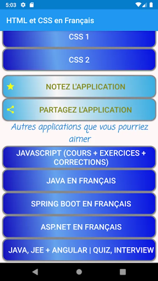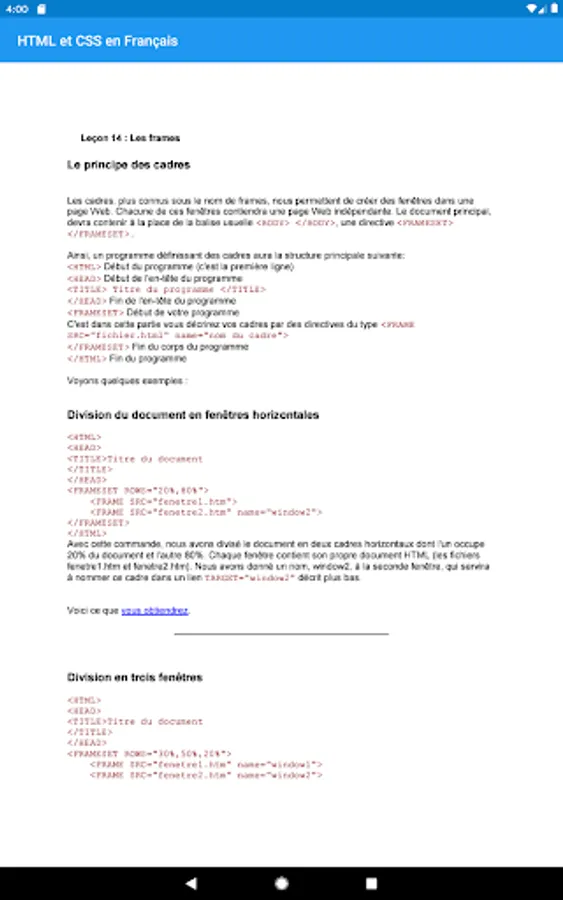 The application provides you with 14 files to read HTML lessons and 2 files to learn CSS, all in French