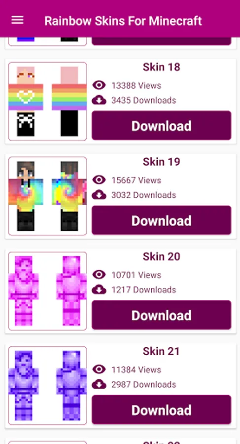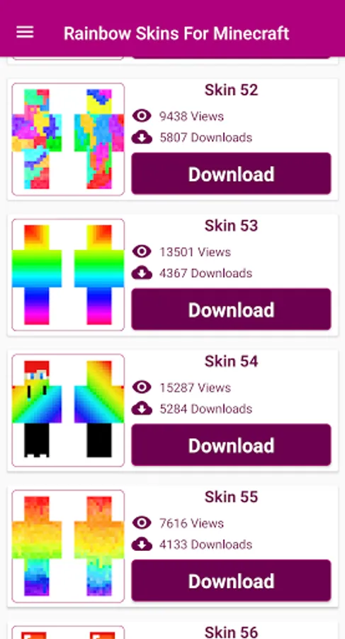 With this app you can get your own skin for Minecraft Pocket Edition. You can change your skin as many times as you want with this app. We have enough Rainbow skins for you to choose from, so you can look as fancy as possible. New skins will be coming very soon, so be ready for more!