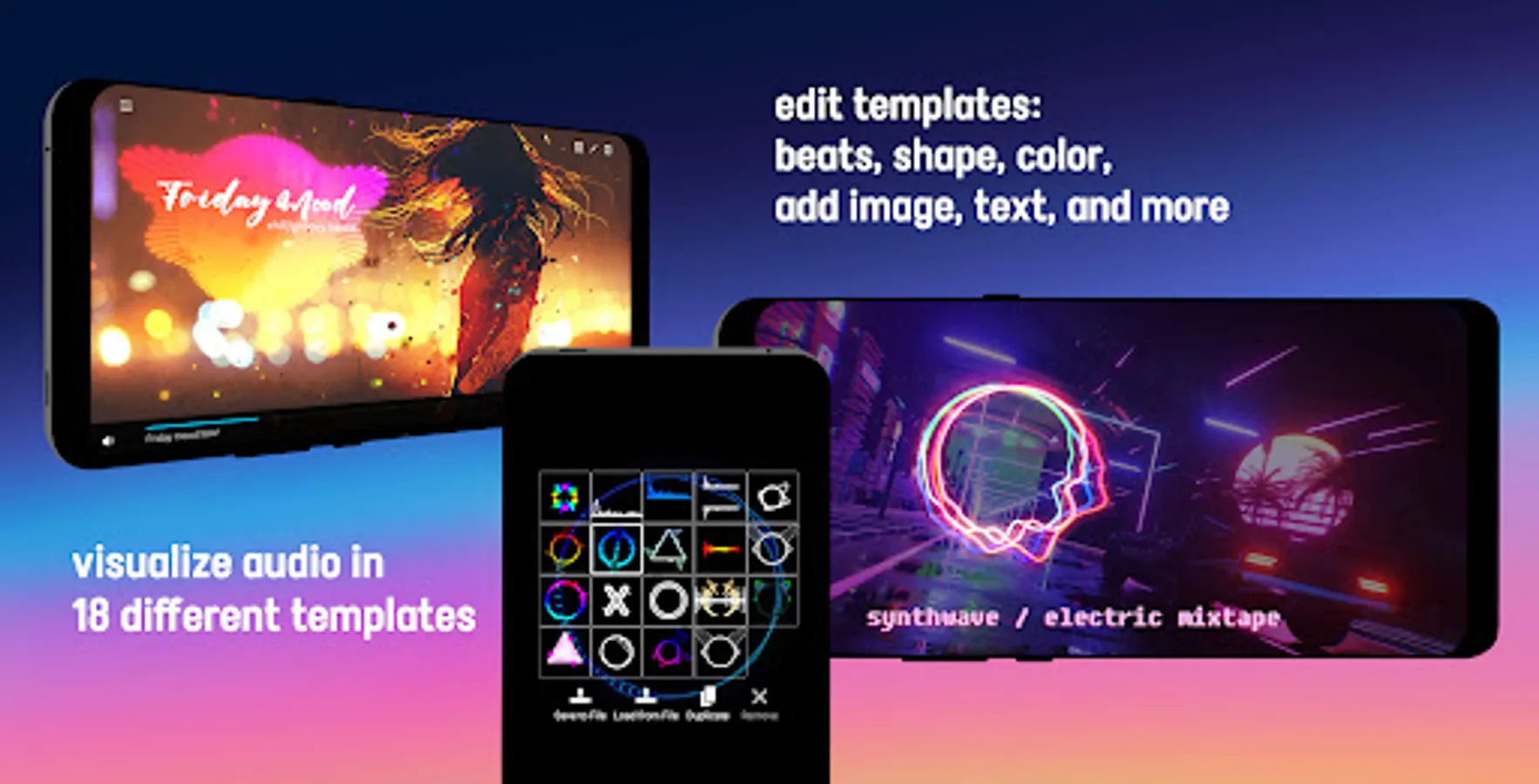 This is a kind of music player that gives you the option to listen and visualize all your favorite music beats with its built-in spectrum visualizer templates and, even more, you can edit and personalize music in video maker section to export your creations as unique musical video clips to share with friends and on social media like YouTube, TikTok, Facebook, Instagram, etc.