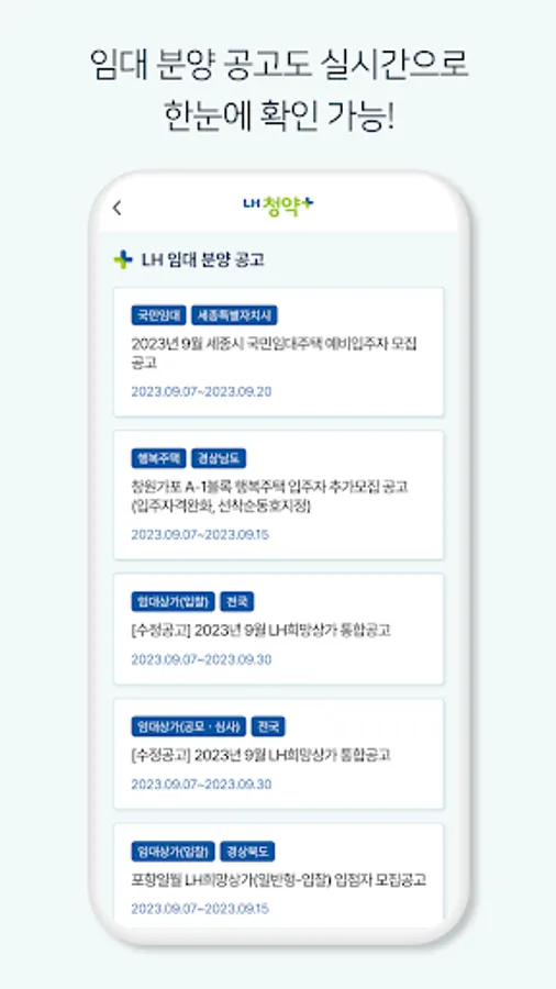 [LH Subscription Plus] provides current announcements so that you can see them at a glance. From rental housing and sale housing to land and commercial buildings! Check the sales announcements you've been curious about by region and period, and don't miss out on applying :)