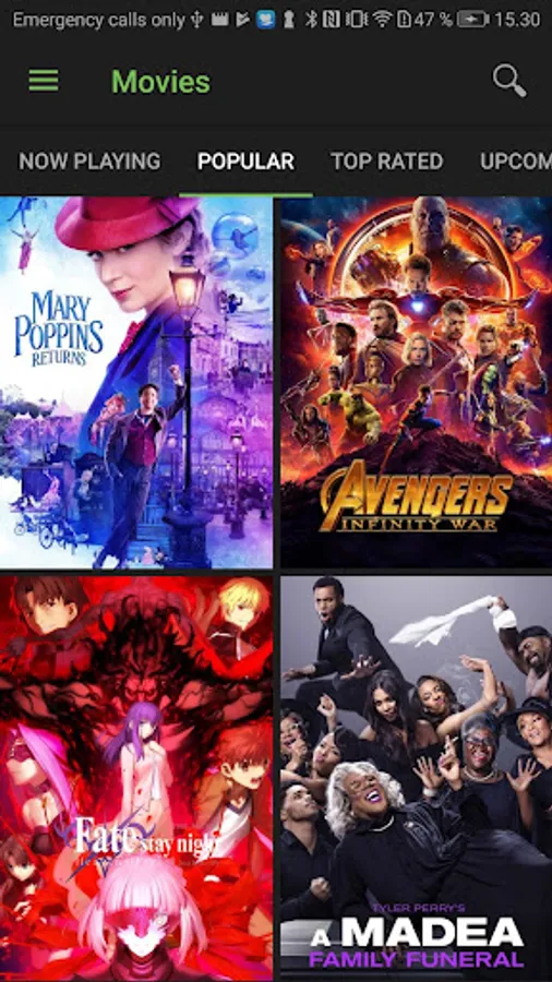 This app is a guide to Google Play so you can easily find on Google Play just click on a button. Among other things it gives you an overview of which movies are currently playing in theaters and which are the most popular ones. If the play button is green it means it is available on Google Play.