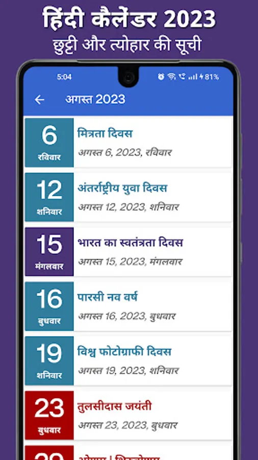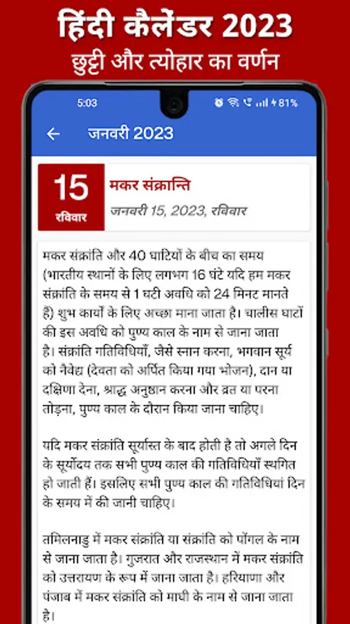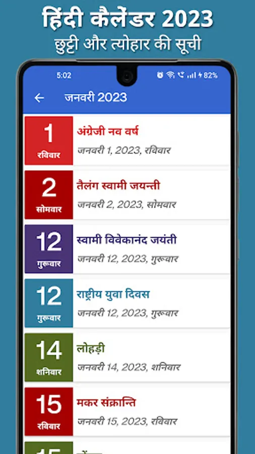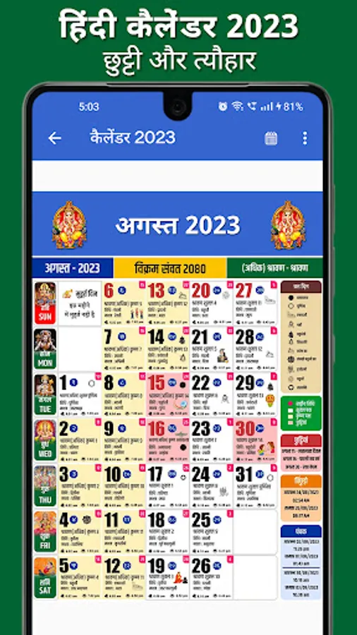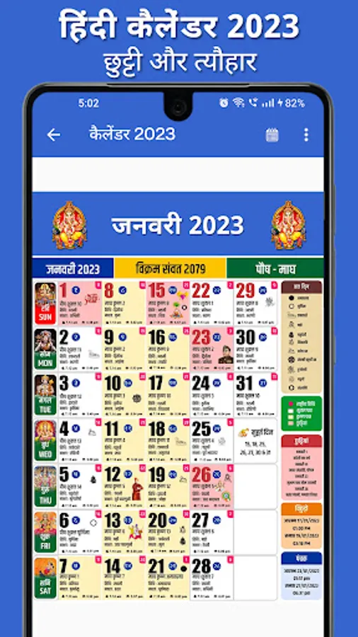 Hindi Calendar 2023 allows you to view maasa, vaara, thithi, nakshatra and all holidays information for all days in the year 2023 in Hindi.