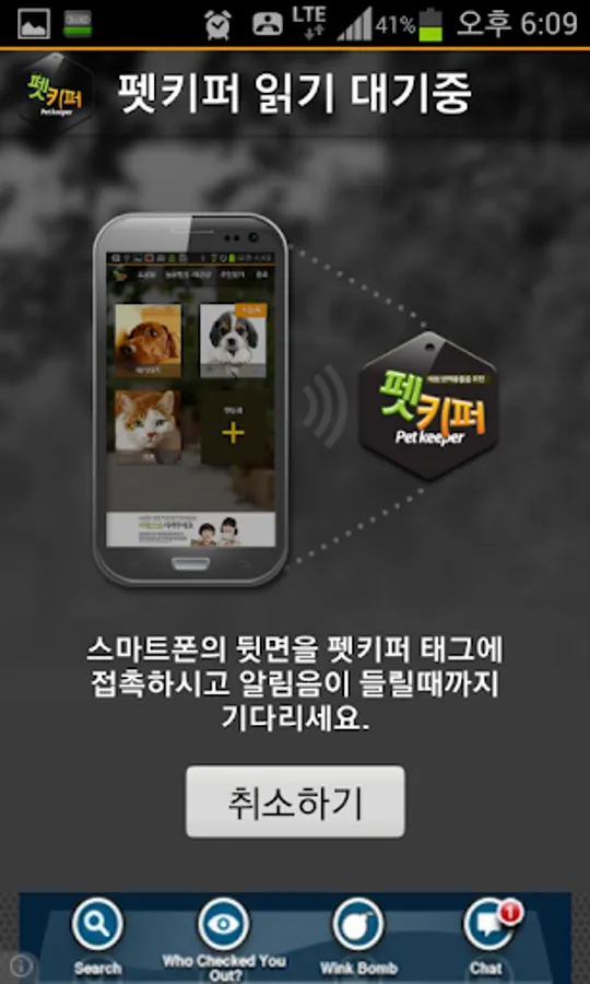 4.등록버튼을 누르고 지시에 따라 펫키퍼용 전자태그를 스마트폰의 뒷면에 대어 명쾌한 알람 소리가 들리면 태그를 분리 하세요