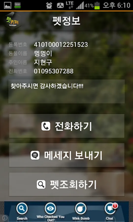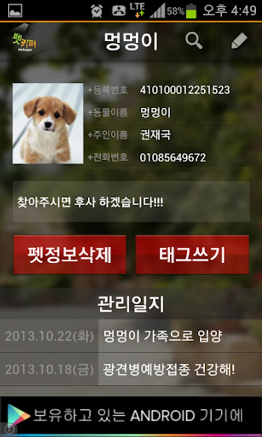 셋째 : 주인의 전화번호가 변경이나 동물을 발견하신 분에게 전하고 싶은 내용을 바꾸고 싶으면 언제든지 펫키퍼앱을 이용하여 새로운 정보를 기록하도록 개발되어 동물을 찾을 수 있는 확률이 높아집니다