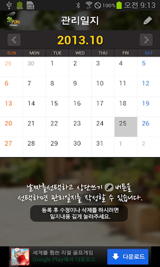 2.하단의 관리일지 부분을 클릭하면 관리일지창이 생성되며 날짜를 선택하신 후 우측상단의 글쓰기 버튼(연필)을 클릭하세요