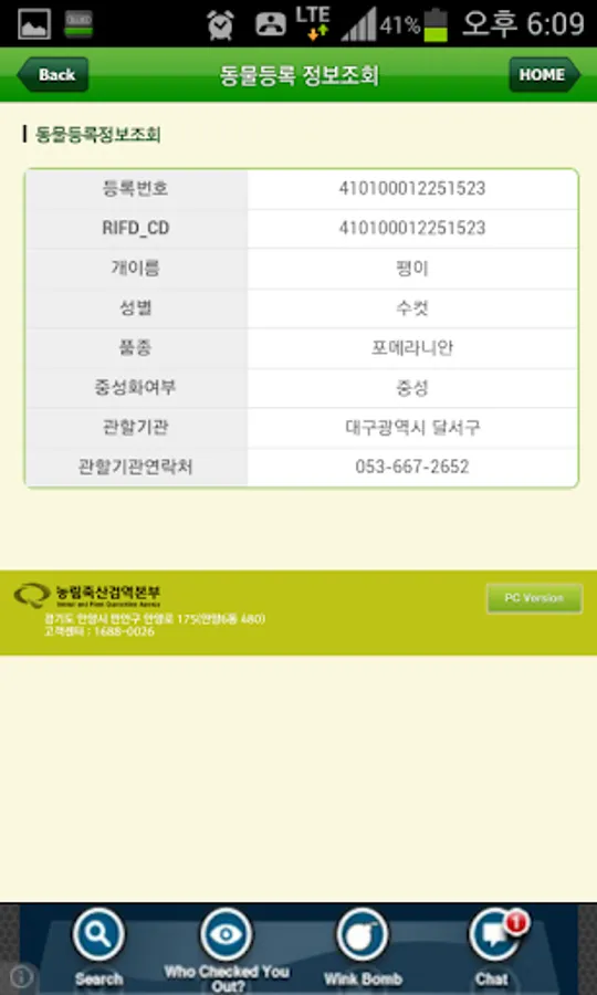 8.“펫조회하기”버튼을 누르시면 동물보호관리시스템 접속하여 등록여부를 확인합니다