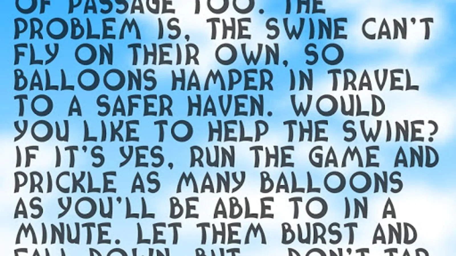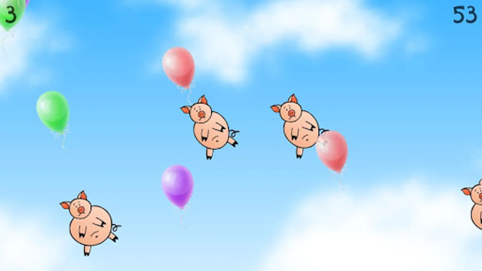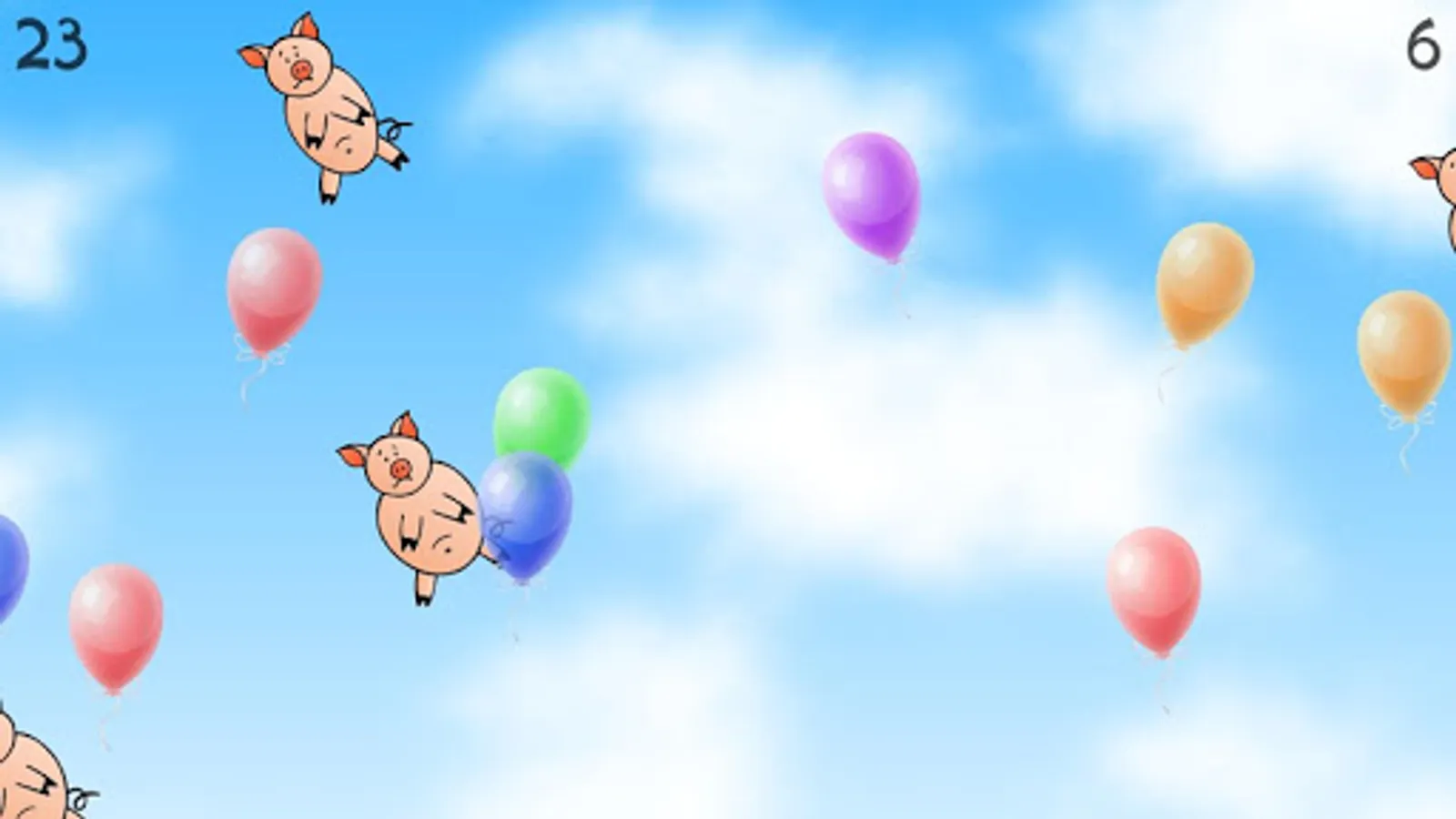 As the wind blows strongly, it carries clouds, balloons and some swine of passage too. The problem is, the swine can't fly on their own, so balloons hamper in travel to a safer haven. Would you like to help the swine? If it's yes, run the game and prickle as many balloons as you'll be able to in a minute. Let them burst and fall down. But... don't tap on the swine, they must pass by freely. Each swine to fall will reduce your time by half and every balloon to pass by unbroken will take two points from your score. Should you not feel like helping, uninstall the app immediately. The swine will be on your conscience.