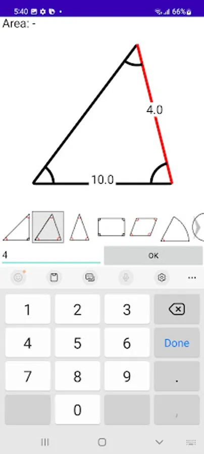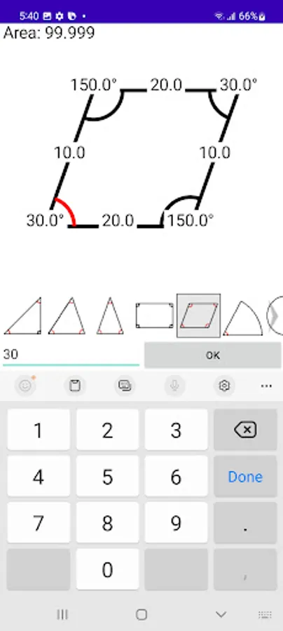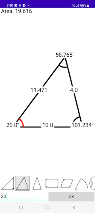 The visual geometry calculator allows you to choose geometric objects and helps you to calculate the lengths, angles and areas of these from a minimum of parameters. Specify any angles or lengths, and as soon as any values can be calculated, these are automatically filled in by the application.