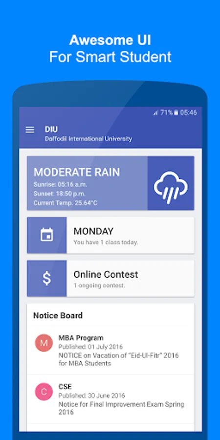Full featured app for the students of DIU (Daffodil International University) with all must have features as a smart student. This is the official app of Daffodil International University.