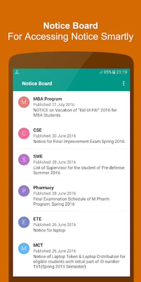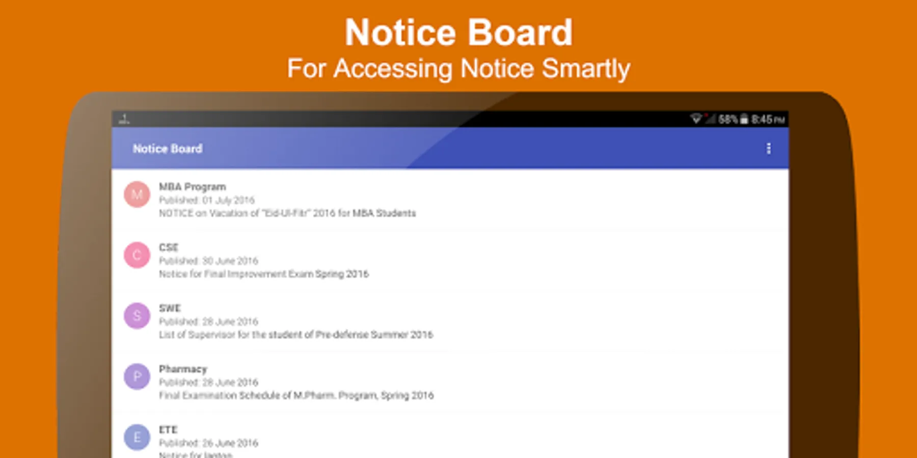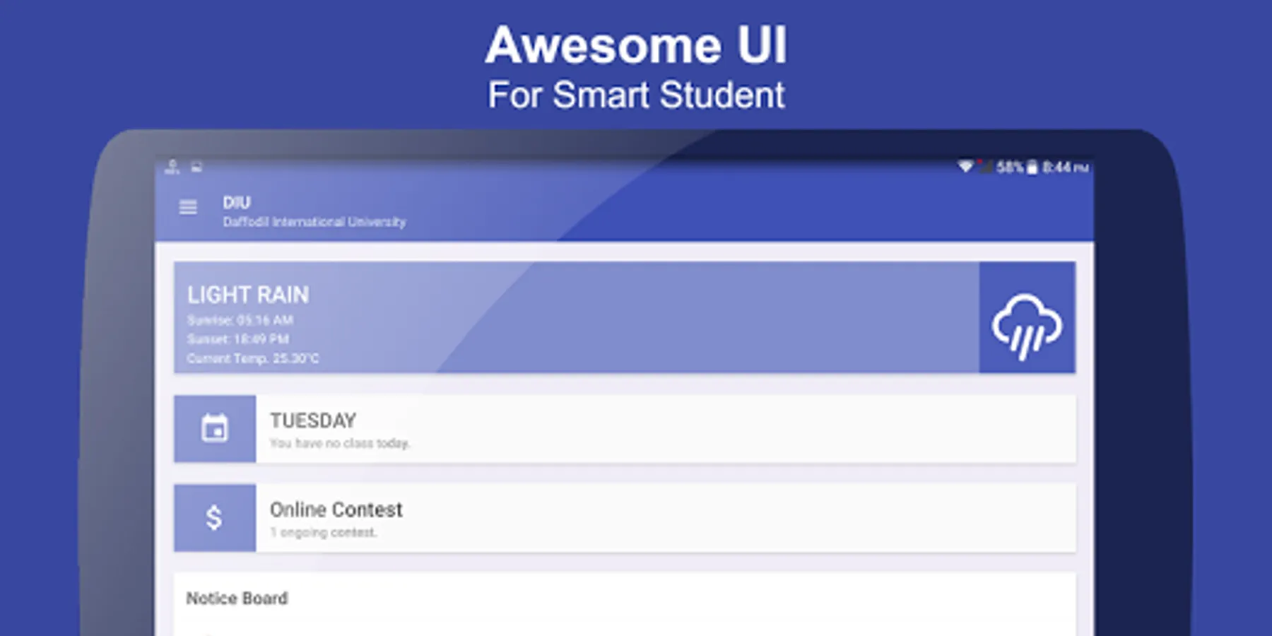 ⇨ Notice Board - allows students to check latest notices of different departments of DIU. Students can enable notification feature for new notices.