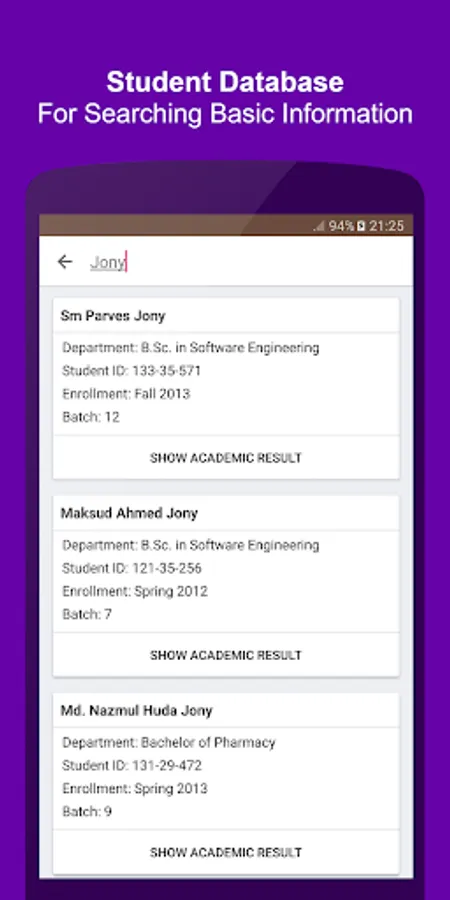 ⇨ Student Database - This area enables a student to find very basic informations of another student. The information can also be found in DIU Website.