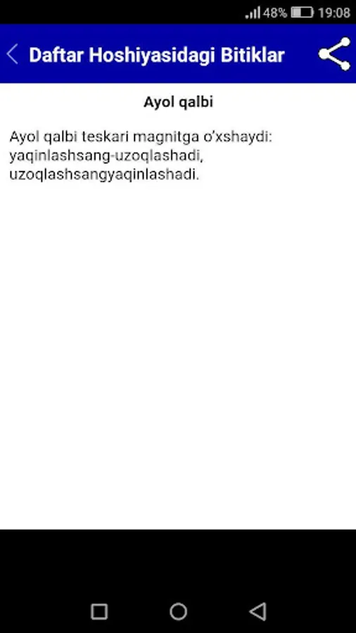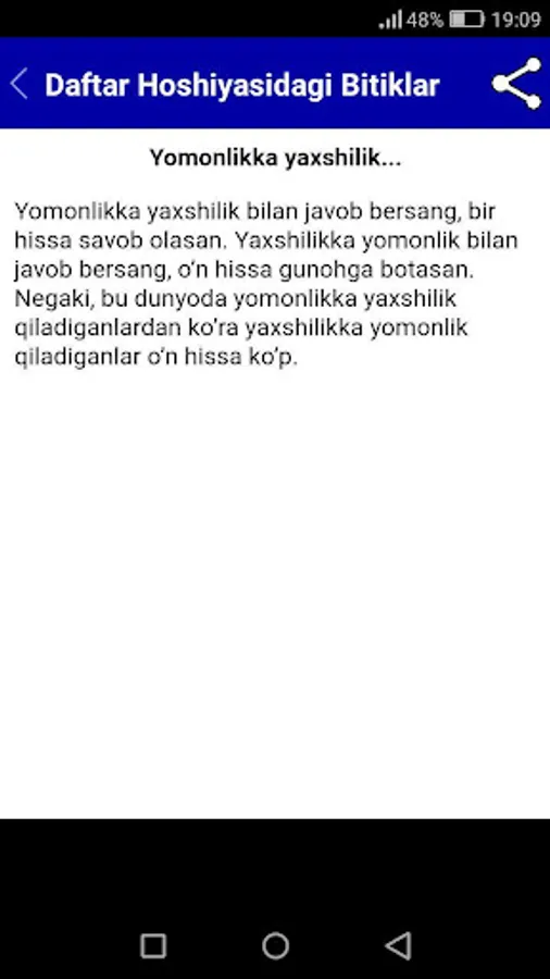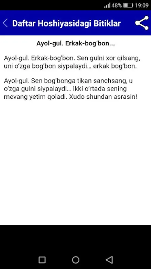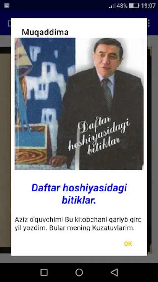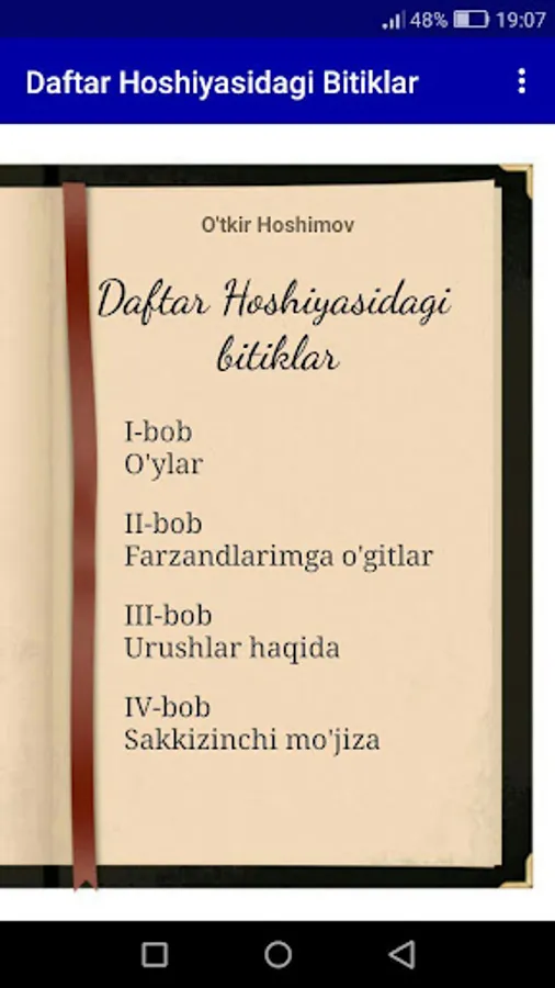Sevimli adibimiz O'tkir Hoshimovning ushbu "Daftar hoshiyasidagi bitiklar" asari kitobxonlar orasida o'zining salmoqli o'rniga ega. Kitobni android ilova ko'rrinishidagi, mobil qurilmalarda o'qish uchun mo'ljallangan ilova shakli sizlarga manzur bo'ladi deb umid qilamiz.