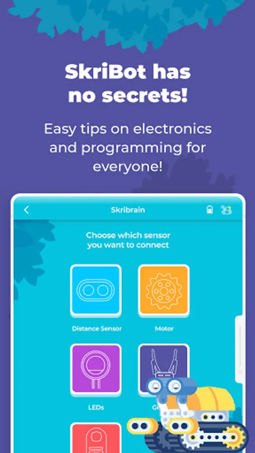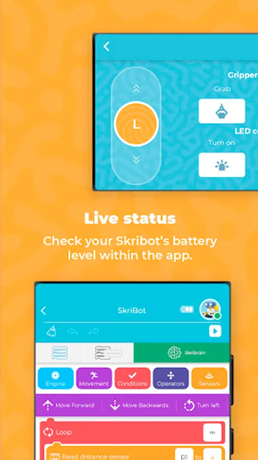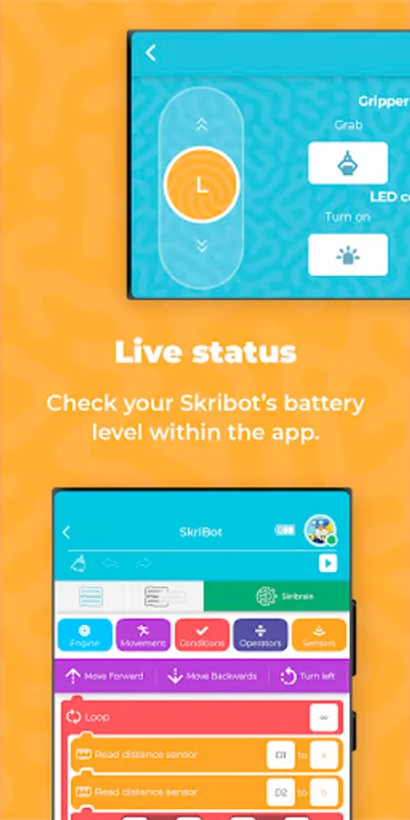 SkriApp is an educational mobile app for learning visual programming, which allows students to test their skills in practice thanks to the immediate translation of the created algorithms into the robot's operation. Thanks to detailed descriptions of the blocks and sets of simple tasks, the application is a great programming tool for students not only in the presence of a teacher but also in case of independent work. SkriApp has 2 modes that allow students to control the robot's movement - visual programming and remote control. They can also create their own blocks and use them in their programs. SkriApp replaces the app previously known as Skribots application.