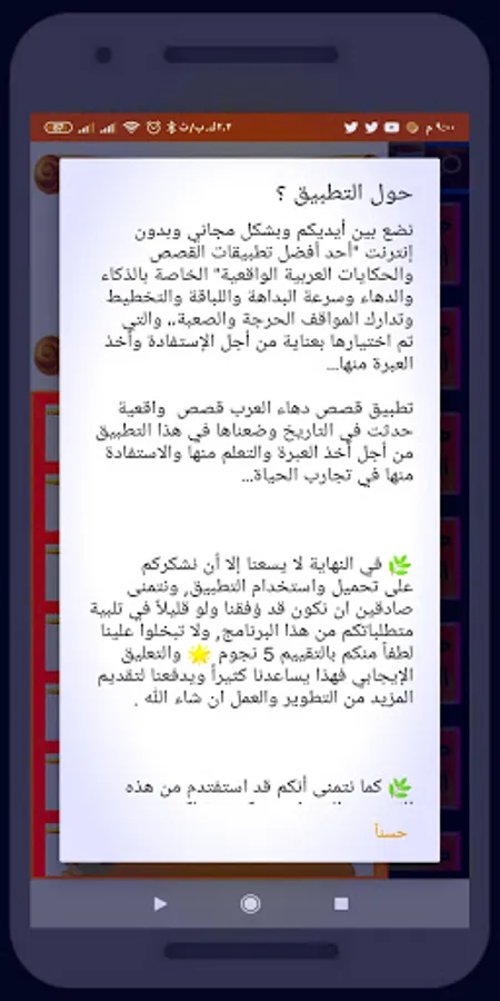The application of the cunning stories of the Arabs, real stories that actually happened in history, and we put them in this application in order to take a lesson, learn from them and benefit from them in life experiences...