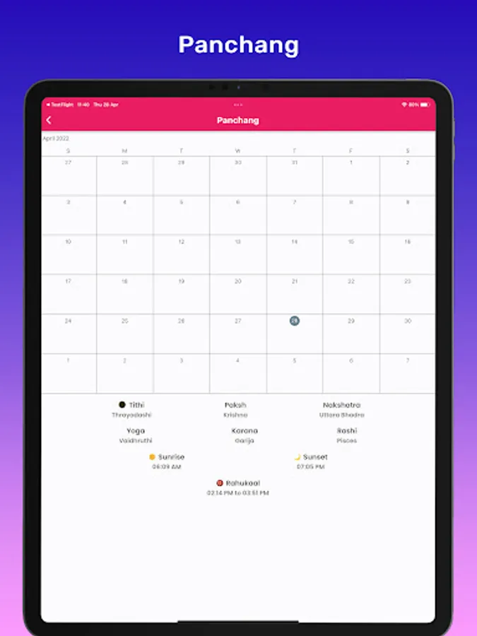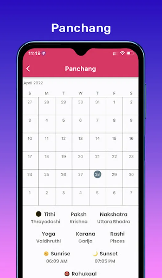Our exclusive Panchang Calendar can easily give the details about constellation, date, paksha, yoga, karana and zodiac.