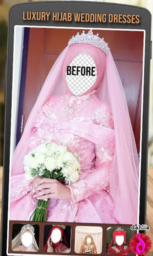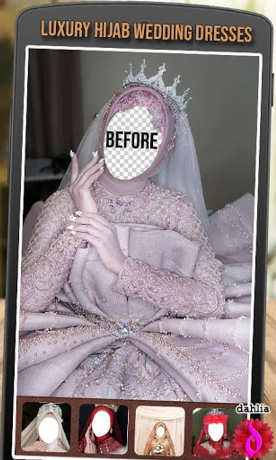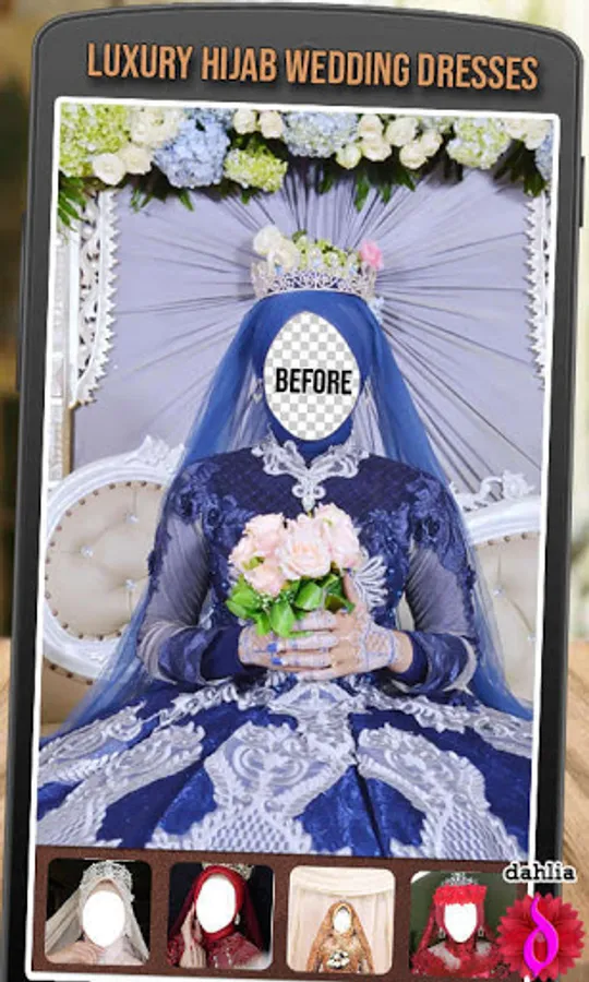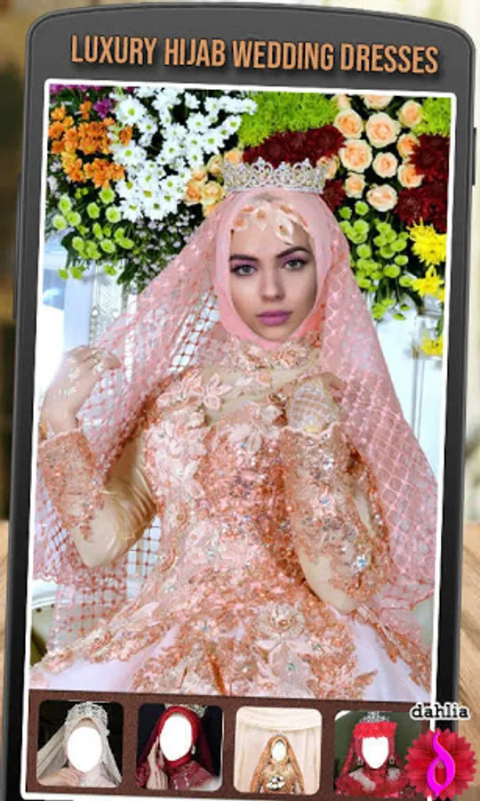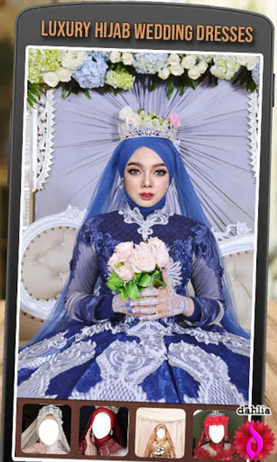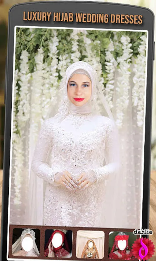 Luxury hijab wedding dresses are easy & fast bridal hijab editing applications. You can try all kinds of modern bridal hijabs and new fashion styles in one easy step with this bridal editor. Find a dress that you like, match it with your face shape so that it looks like you are wearing a real bridal hijab dress.