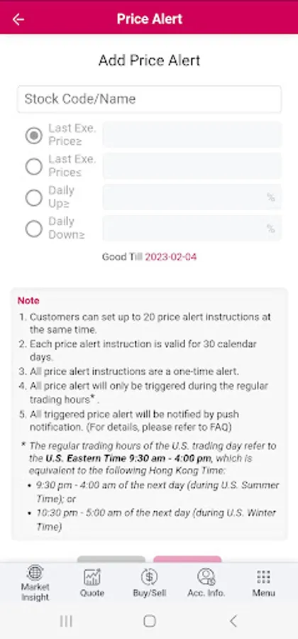 Dah Sing Bank will from time to time update and enhance the stock trading feature in the US Securities Trading App to enable better and more comprehensive services through the mobile channel.