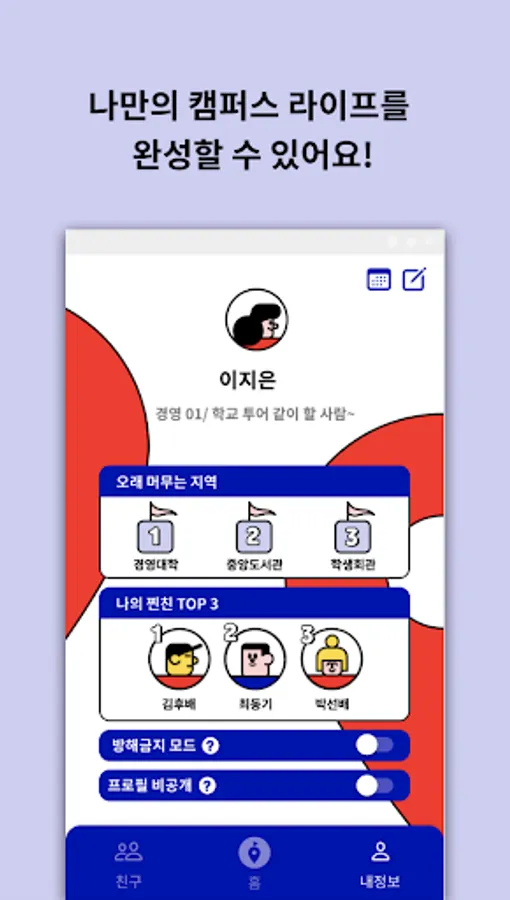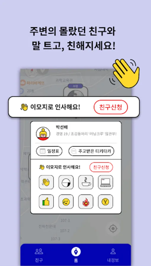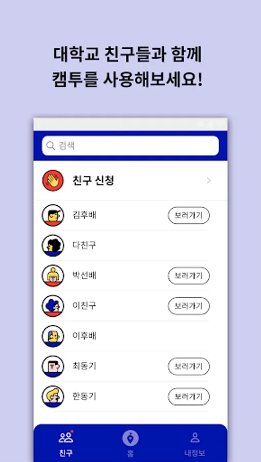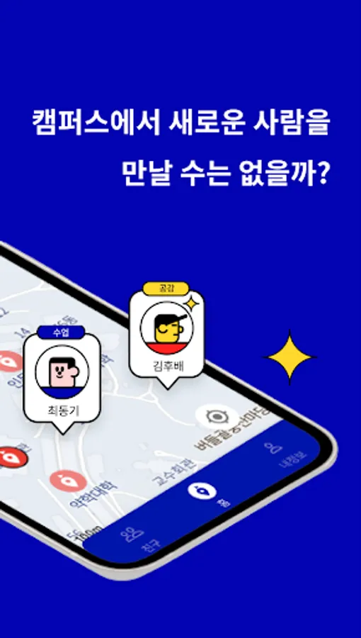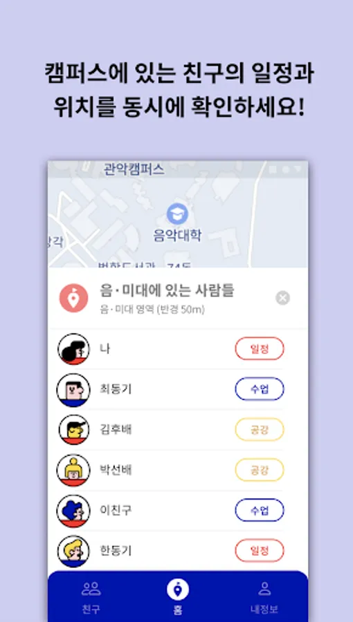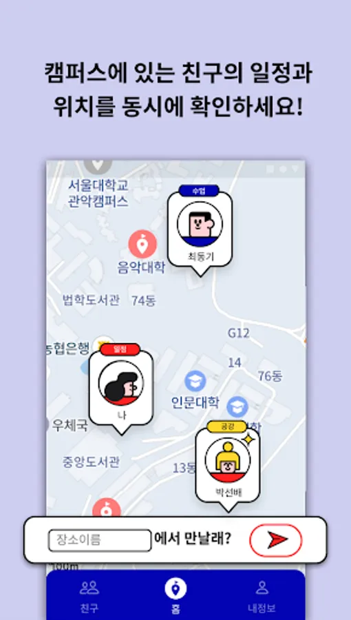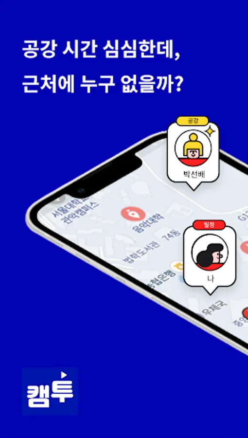 Cam2 is a location-based social media specialized for university campus spaces. You can check the schedule and location of your friends in school at a glance. Send emoticons to classmates in the library! How about suggesting a lightning coffee time to a friend of Gonggangin?