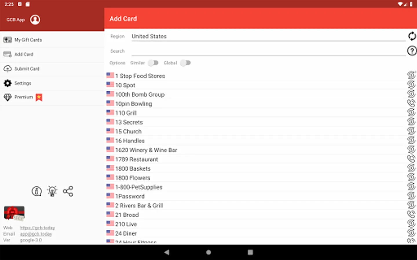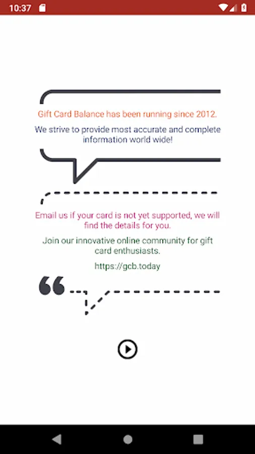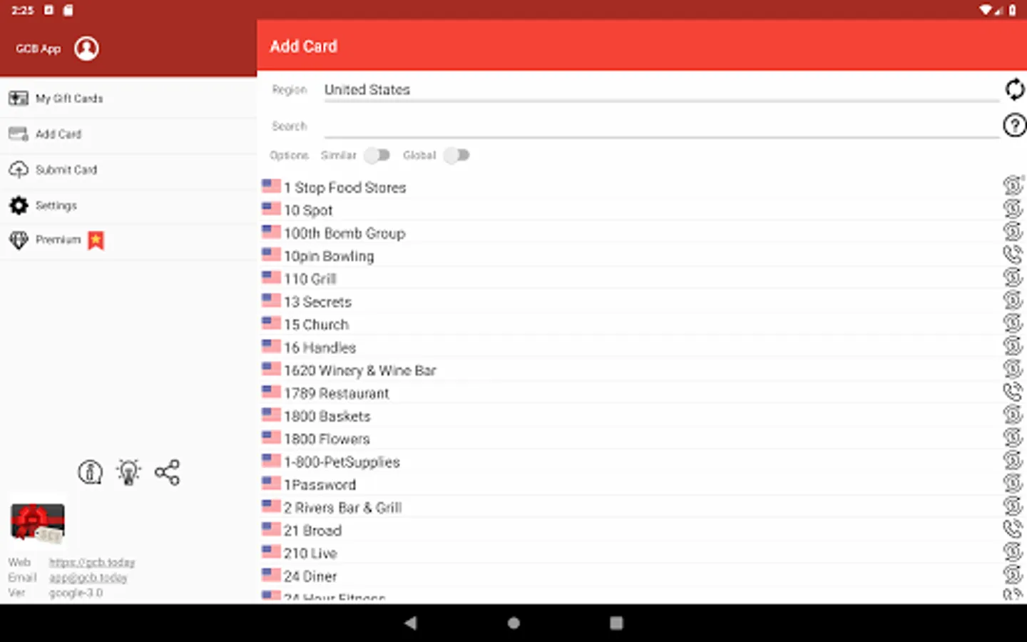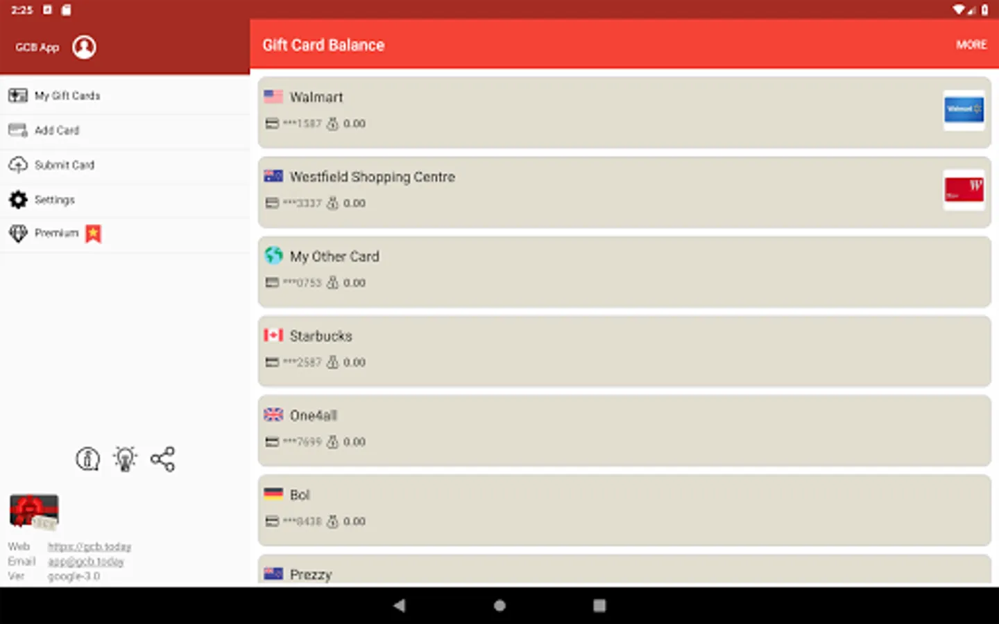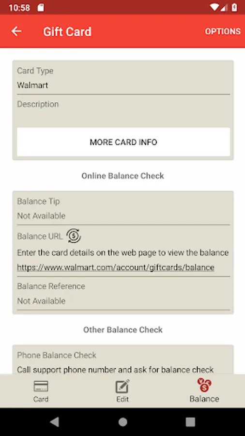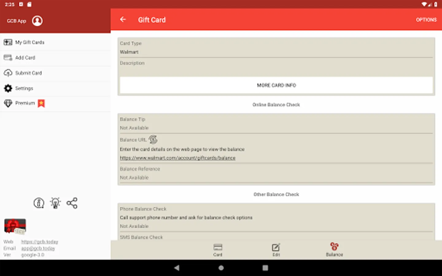 Gift Card Balance (GCB) checks live giftcard balance. The mobile app wallet offers a simple yet accurate way to retrieve real time card balances since 2012. Balance query is performed by connecting directly to the website of card merchant. All giftcard records and photos are 100% stored in your phone. More info: https://gcb.today/app