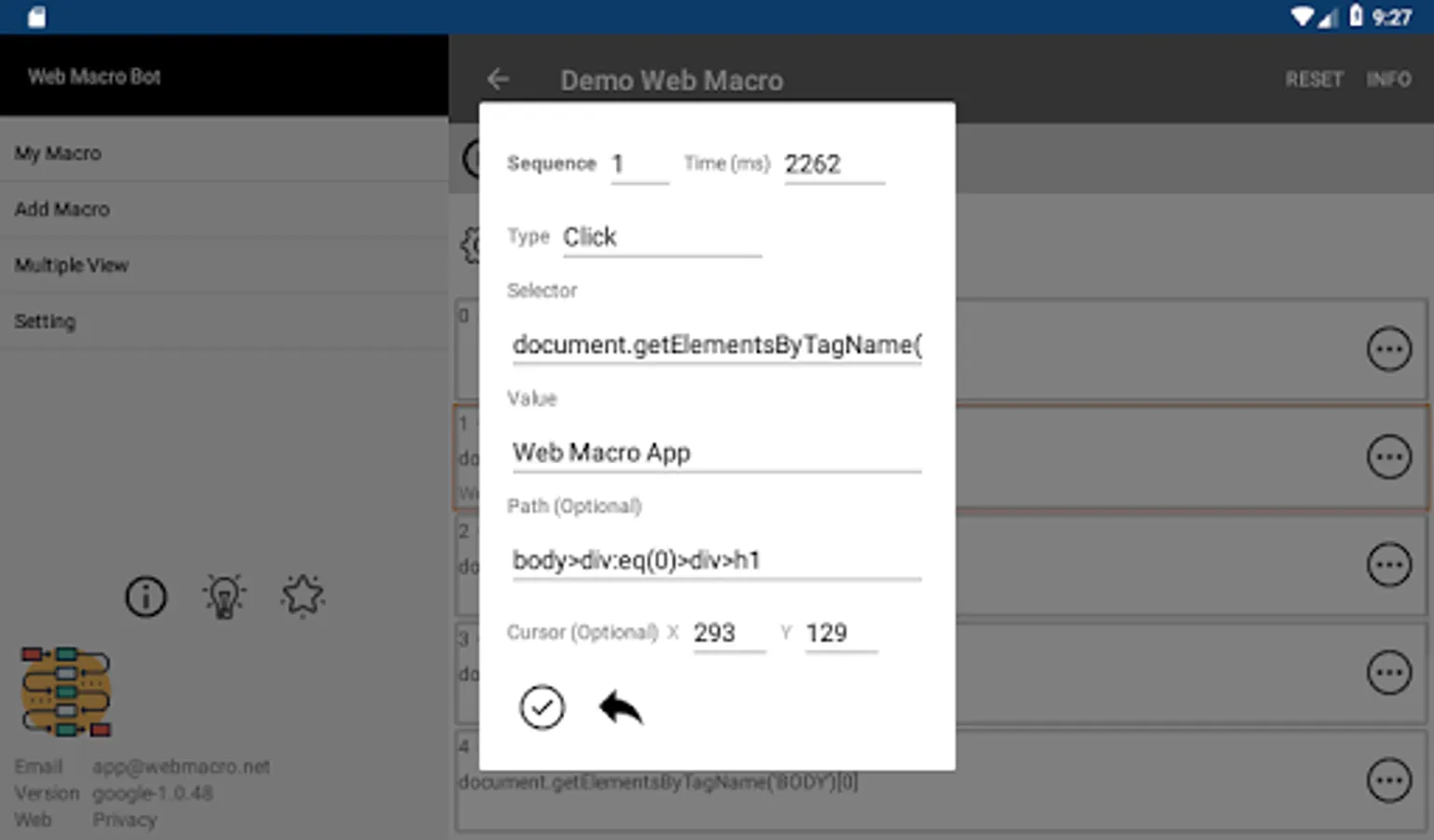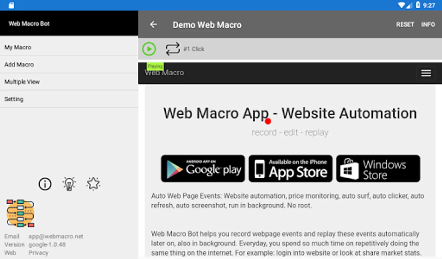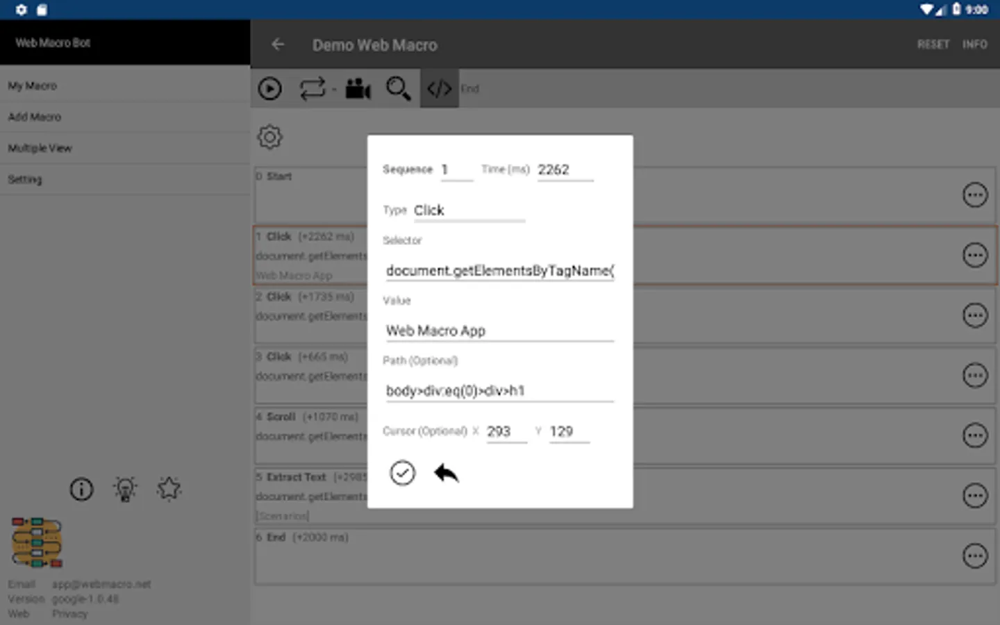 Web Macro Bot helps you record webpage events and replay these events automatically later on, also in background. Everyday, you spend so much time on repetitively doing the same things on the internet. For example: login into websites or look at share market stats.