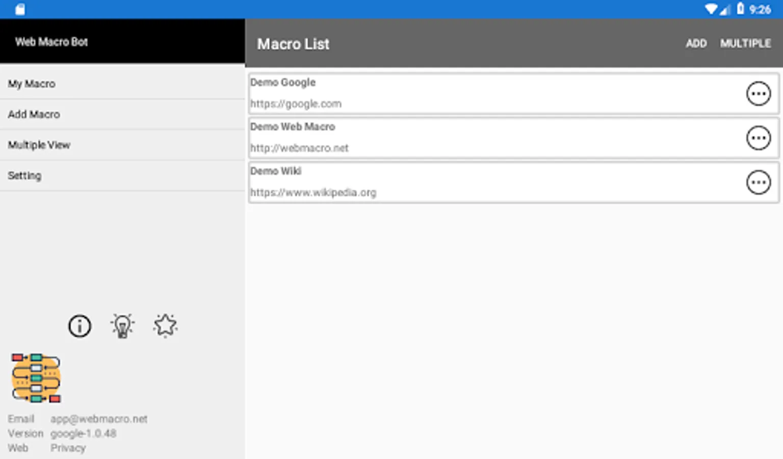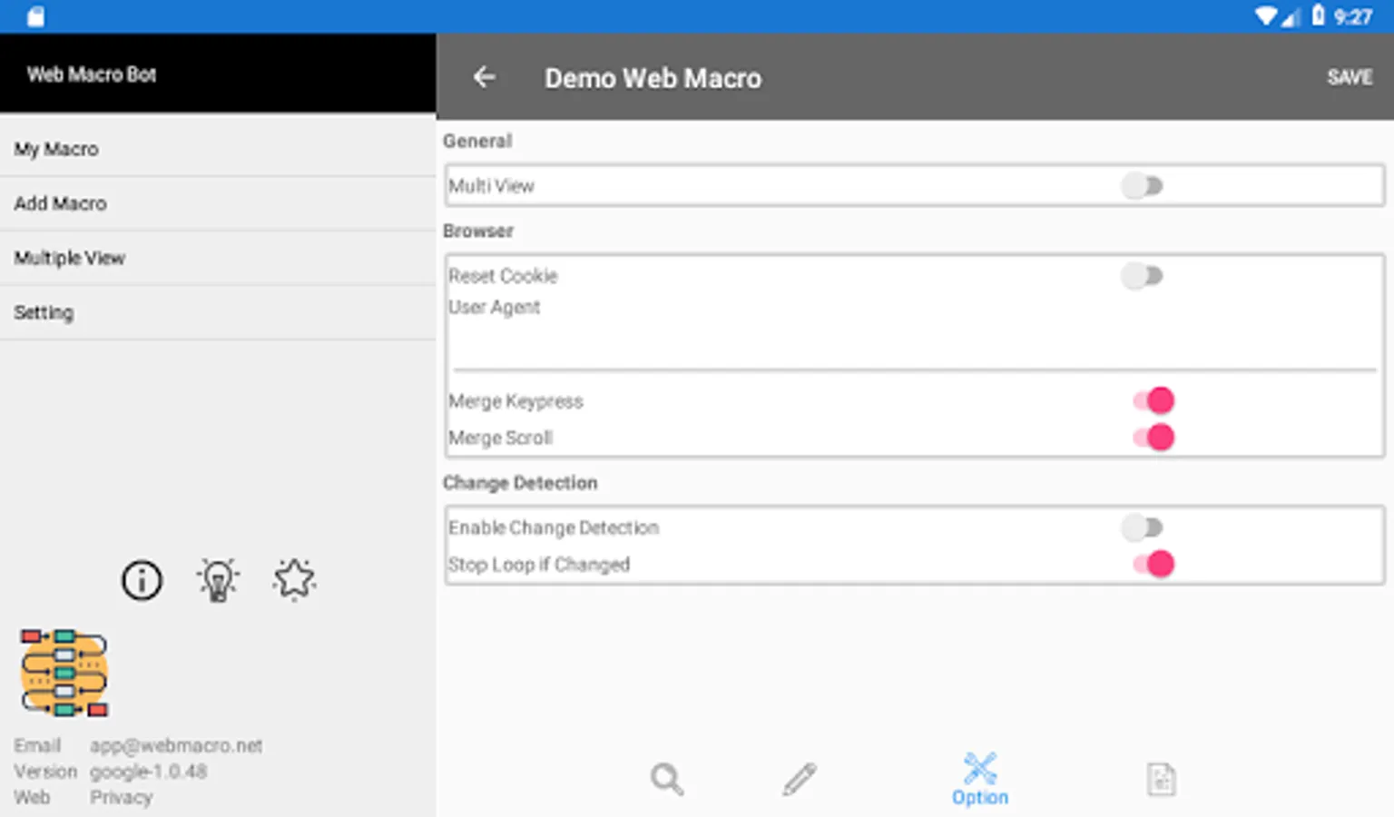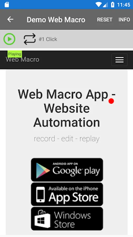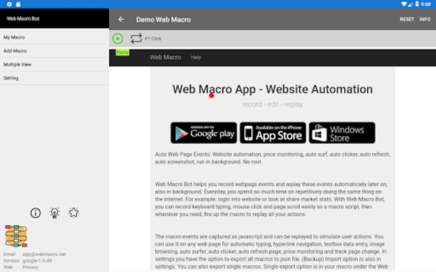 Web Macro Bot helps you record webpage events and replay these events automatically later on, also in background. Everyday, you spend so much time on repetitively doing the same things on the internet. For example: login into websites or look at share market stats.