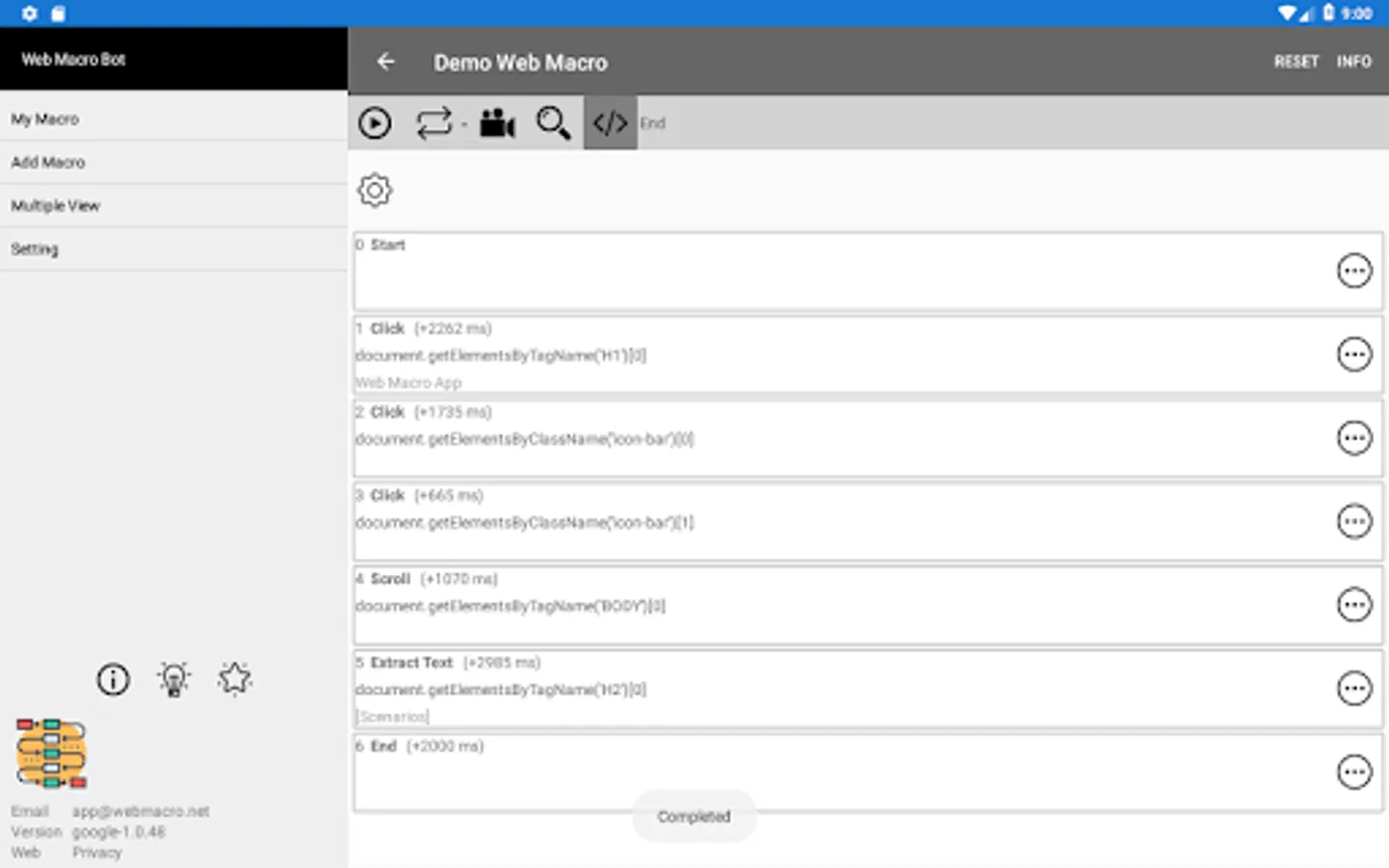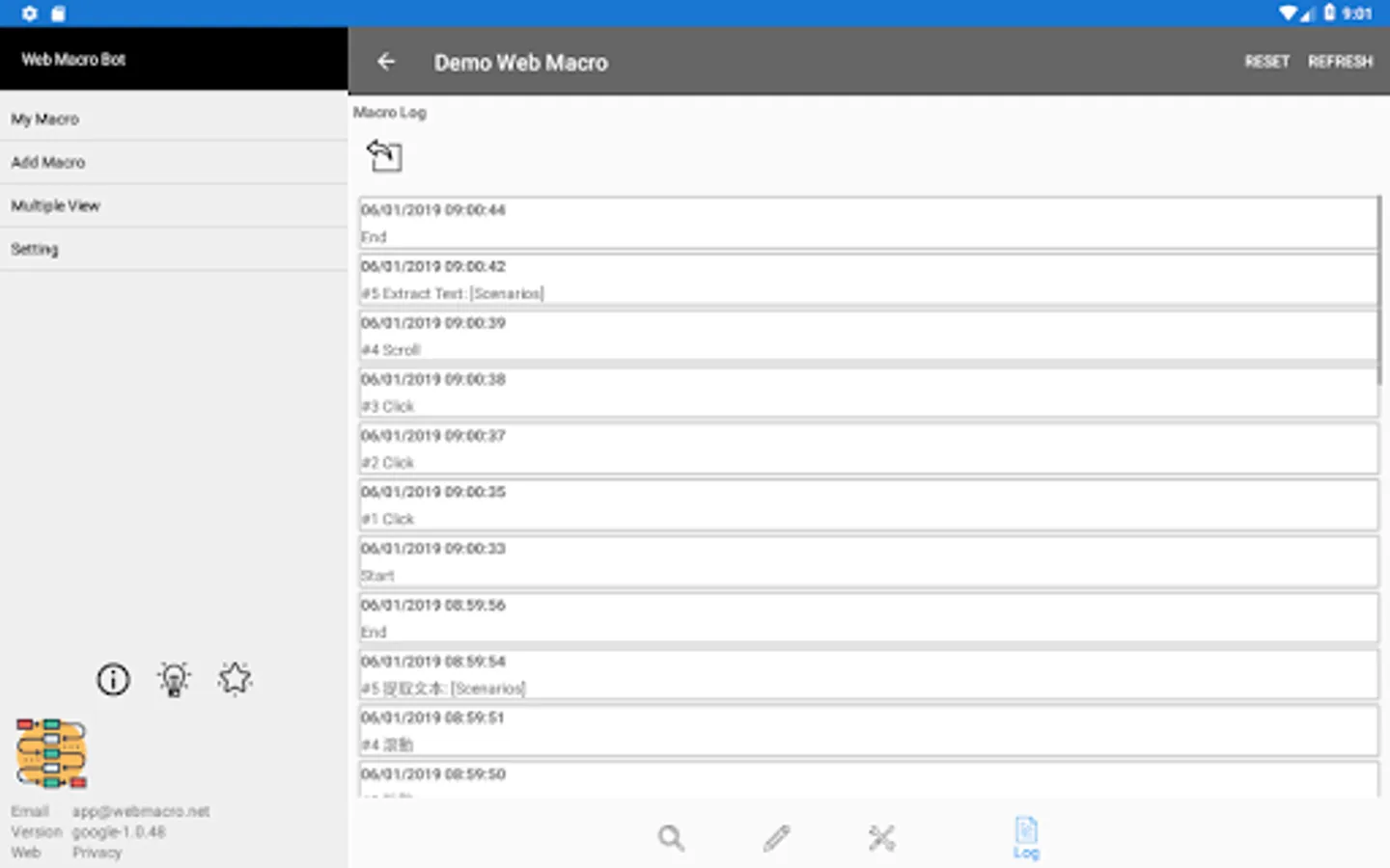 With Web Macro Bot automation tool, you can record keyboard type, mouse click and page scroll easily as a macro script, then whenever you need, fire up the macro to replay all your actions repeatedly.