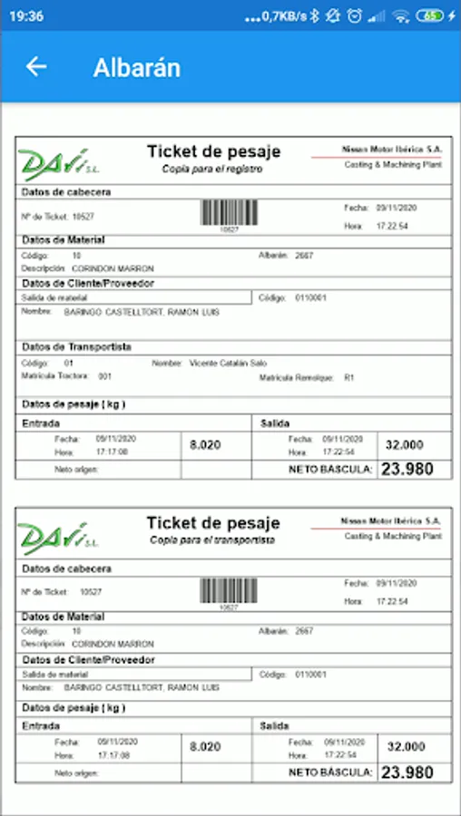When a weighing operation is finished from TPNetMobile, the receipt corresponding to that weighing is printed in Heavy Traffic .NET, the external processes configured are executed, the PDF documents for the delivery note are automatically created and sent by e-mail (according to configuration ).