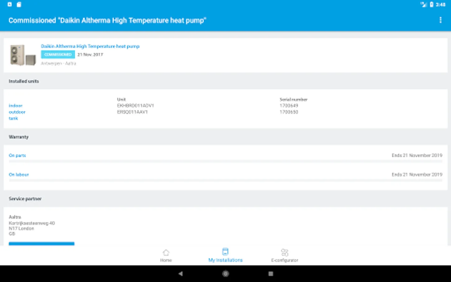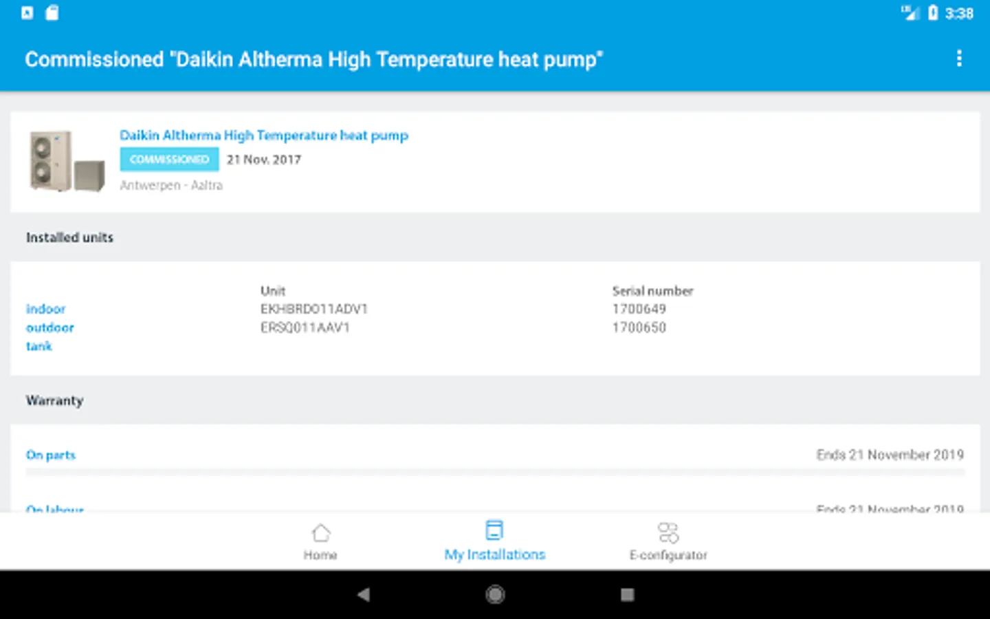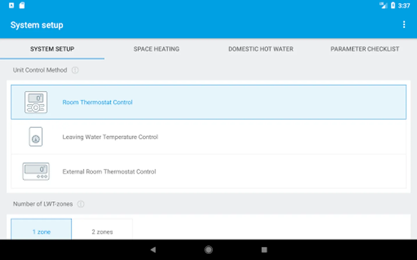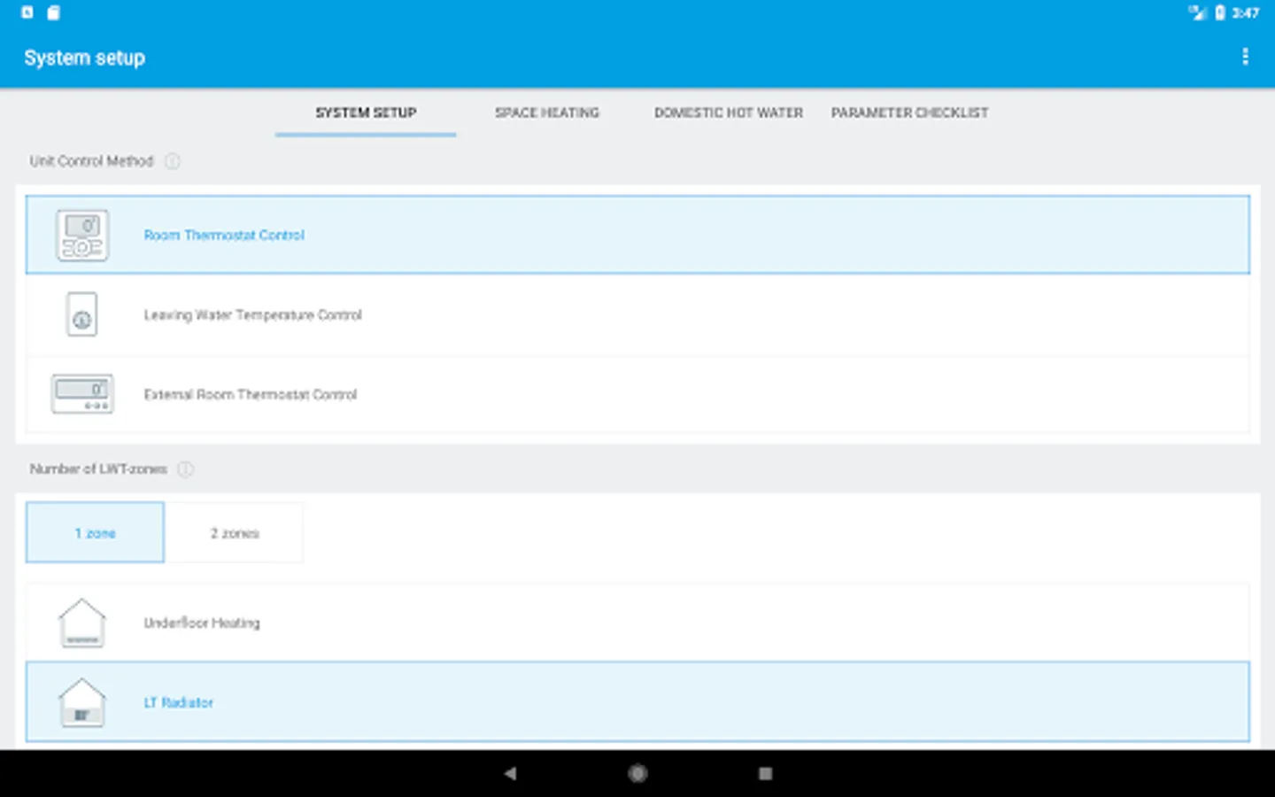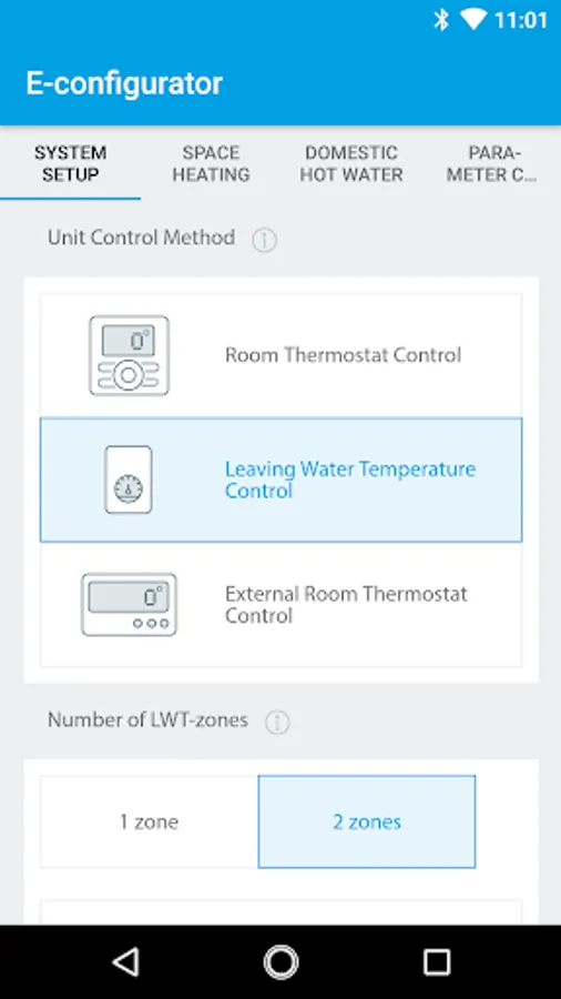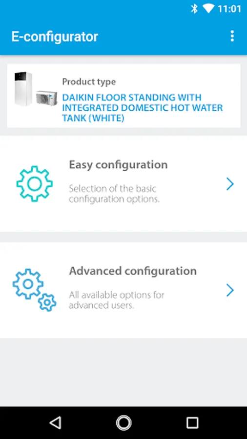 Quick configuration of the settings of your heating system. The app is fit for the Daikin’s heat pump range. To start the e-configurator, you can either scan the QR code of the nameplate, either type the productname of the unit. The parameter setting can be done on an ‘easy mode’, which is the default setting, or an ‘advanced mode’. In a first tab, the parameters which are ‘system-related’ are being defined in a few clicks. In a second tab, the settings related to space heating are set. Depending on your solution, a Domestic Hot Water tab is also available. In just 8 to 10 clicks, all settings of the heat generator are being defined and in a last tab, you can find an overview of all settings. The changed settings are being highlighted.