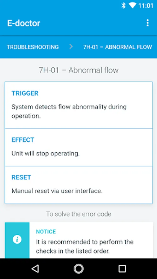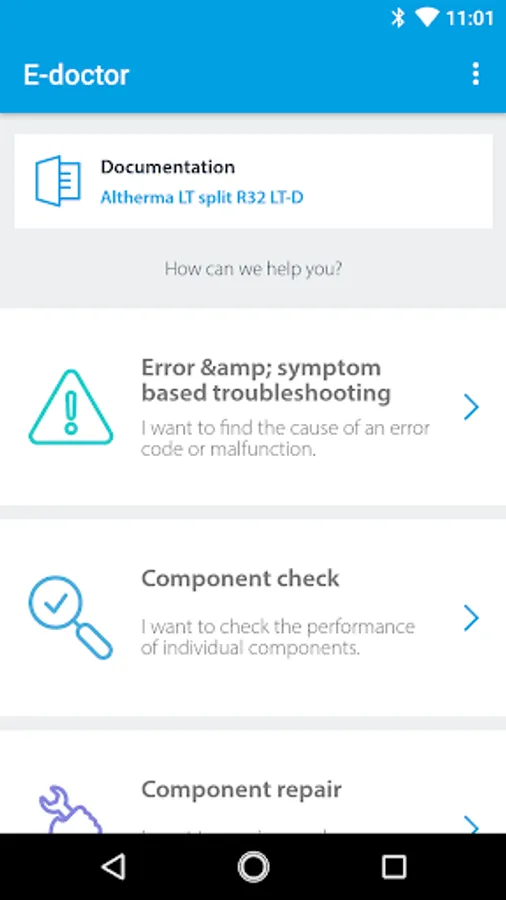 The Daikin e-Doctor is a mobile application, that guides service technicians during troubleshooting, component check and repair of Daikin units.