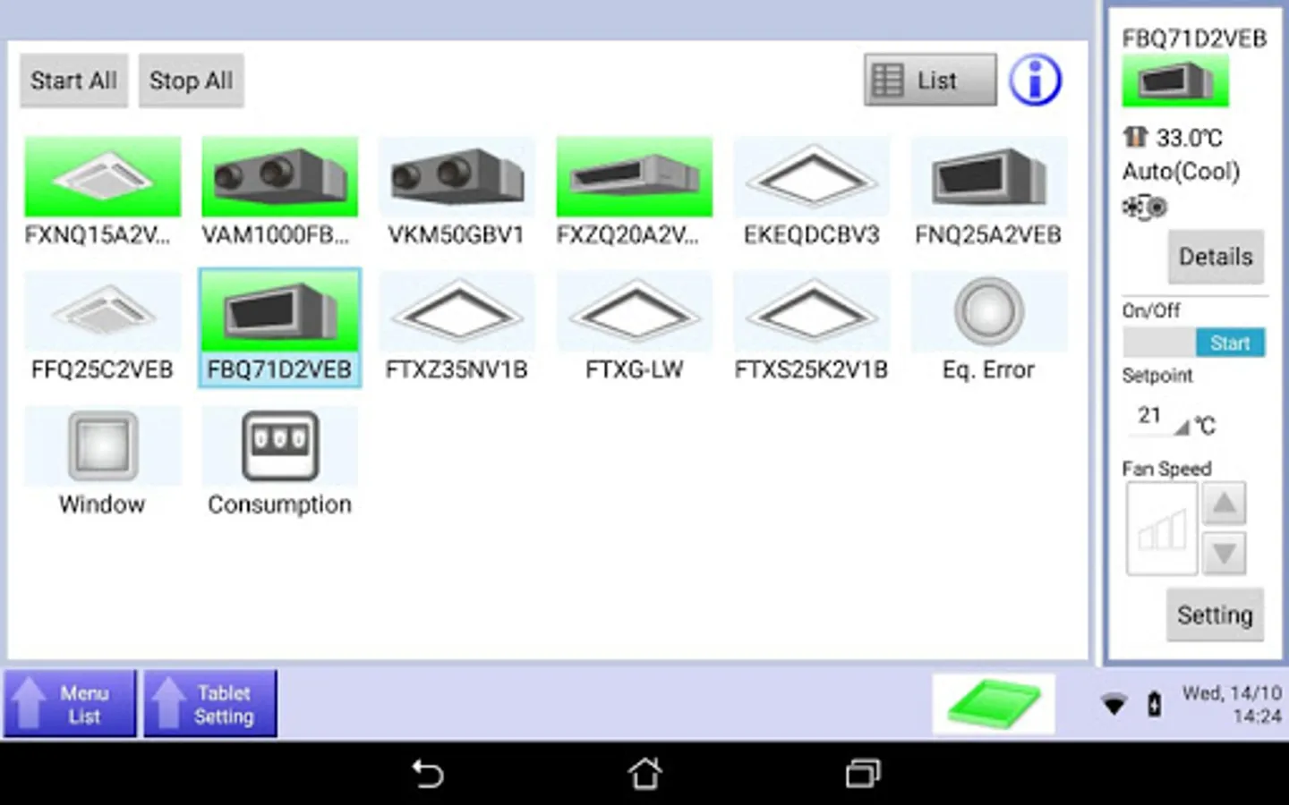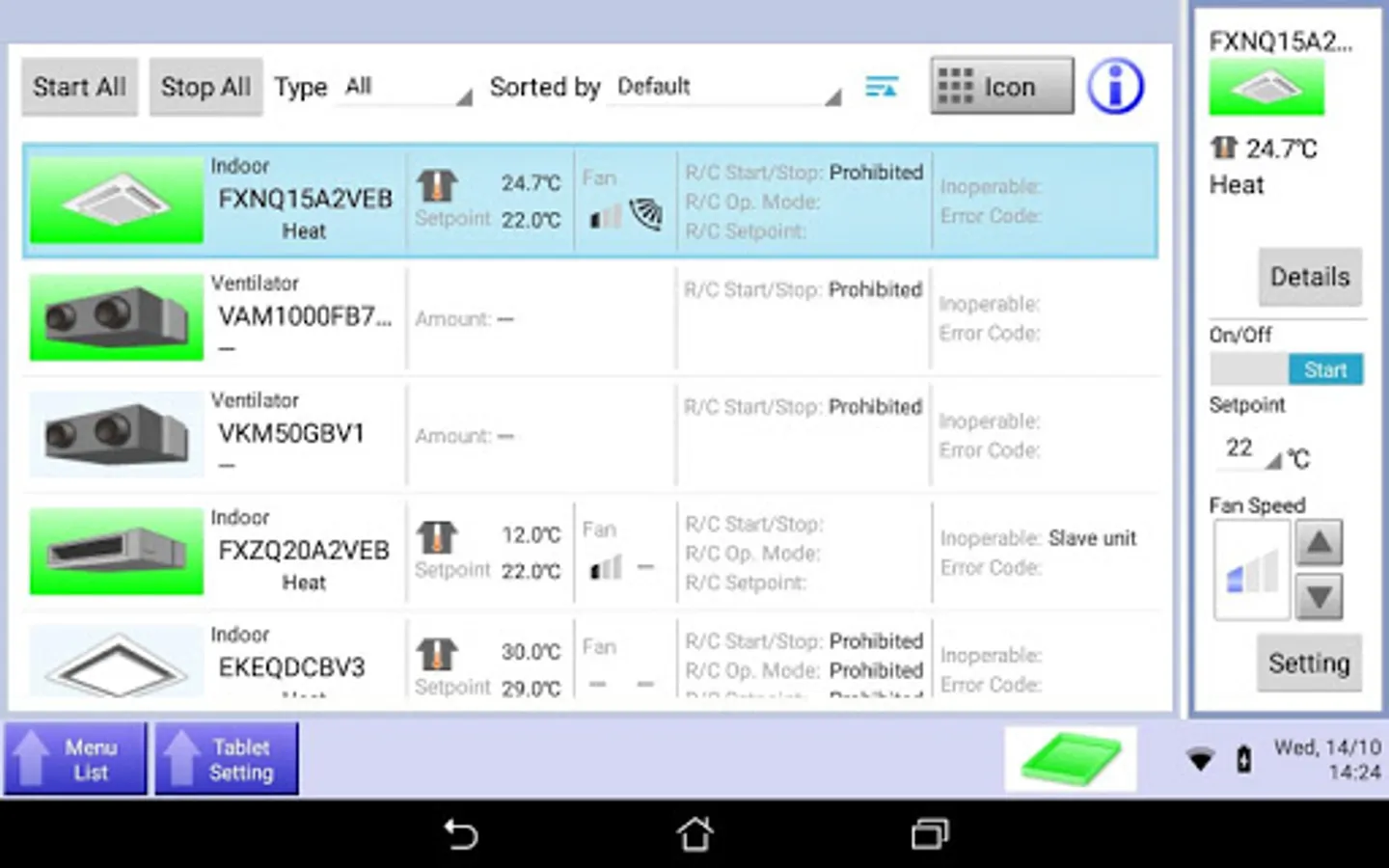 With the intelligent Tablet Controller application, you can manage compatible Daikin heating, cooling and ventilation (HVAC) units from your local network. This application requires the intelligent Tablet Controller kit.