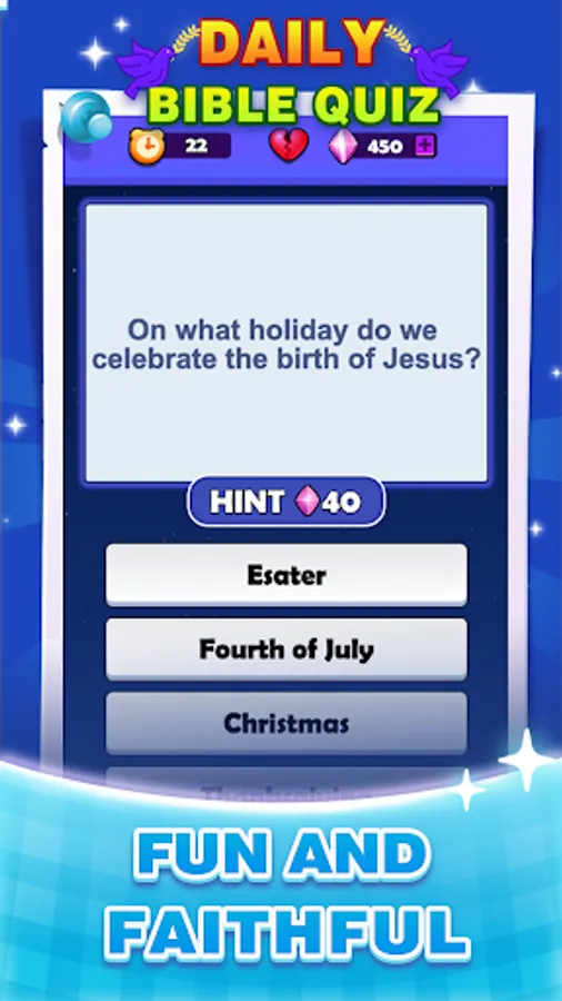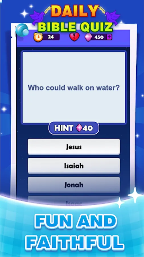 Looking for a new approach to Bible study? Daily Bible Quiz is a Bible quiz game for Christians and believers! Fun and smart questions and answers will help you learn all the important facts about Christianity, play daily bible quiz games and bring you closer to your Lord!