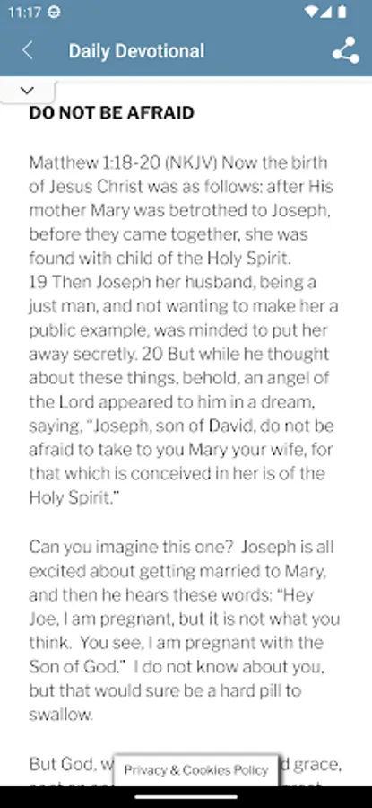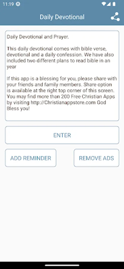 This daily devotional comes with bible verse, devotional and a daily confession. We have also included two different plans to read bible in an year If this app is a blessing for you, please share with your friends and family members. Share option is available at the right top corner of this screen. You may find more than 200 Free Christian Apps by visiting http://Christianappstore.com