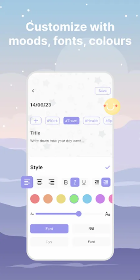 Customization Options: Personalize your journaling experience with a variety of fonts, themes, and colors. Make your diary truly yours by customizing the app's appearance to reflect your unique style.