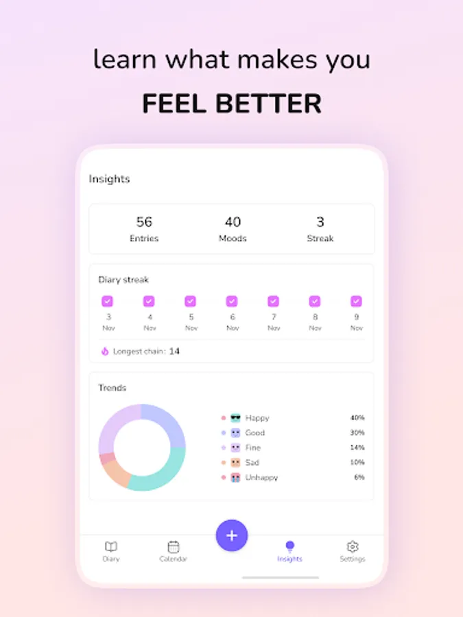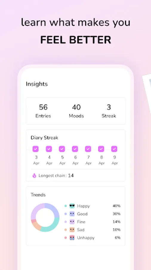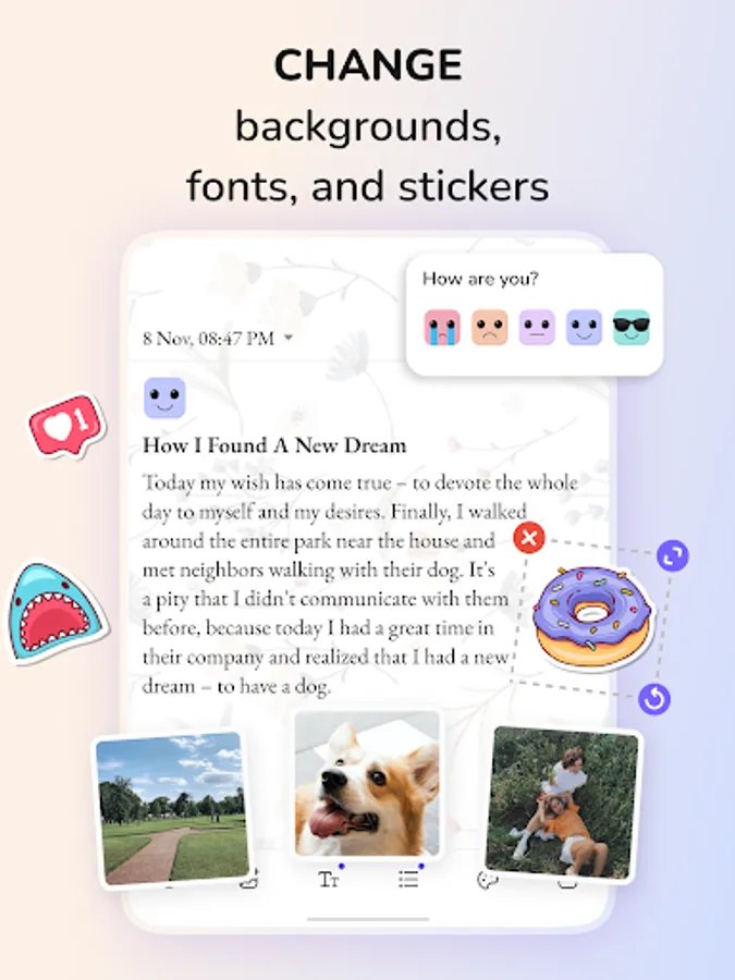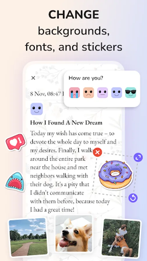 Daily Diary 📔 Journal with Lock - is your personal journal for every day. It is a diary with a lock and mood tracker for you to note your experiences, explore your emotions and add photos to the entries. Make it your private and secure notebook, use it as a journaling app for free.