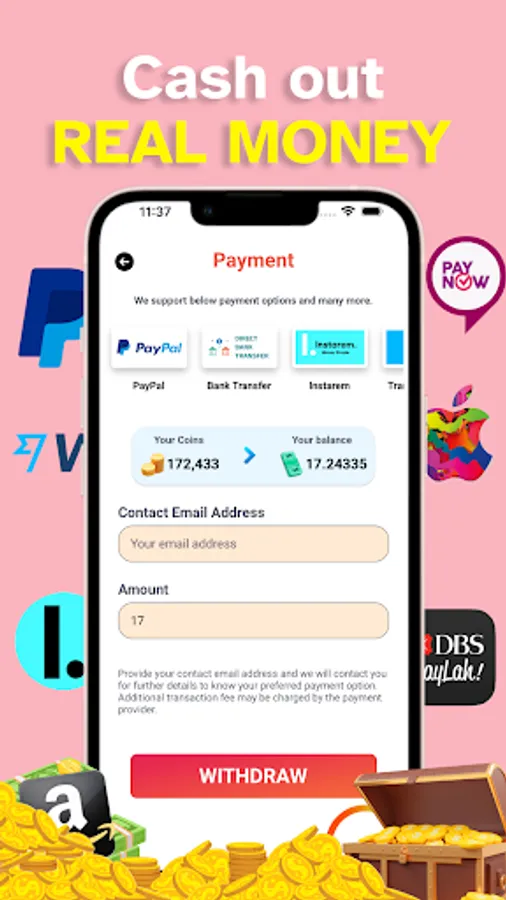 The only app that supports a hassle-free way of withdrawing instantly. Withdraw your money into real money via PayPal, Wise, UPI payment, DBS Paylah, PayNow, Apple Gift Cards and many more. Check out other possible ways in the app.