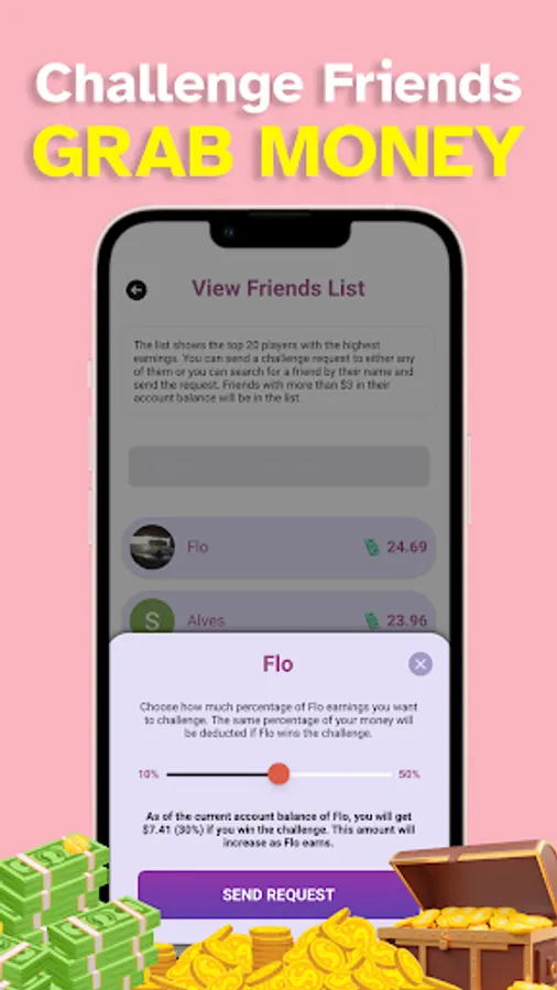 ✔ Challenge Friends: Grab your friends money by challenging them. Challenge runs for 24 hours and you have a chance to grabbing your friends 50% earnings.